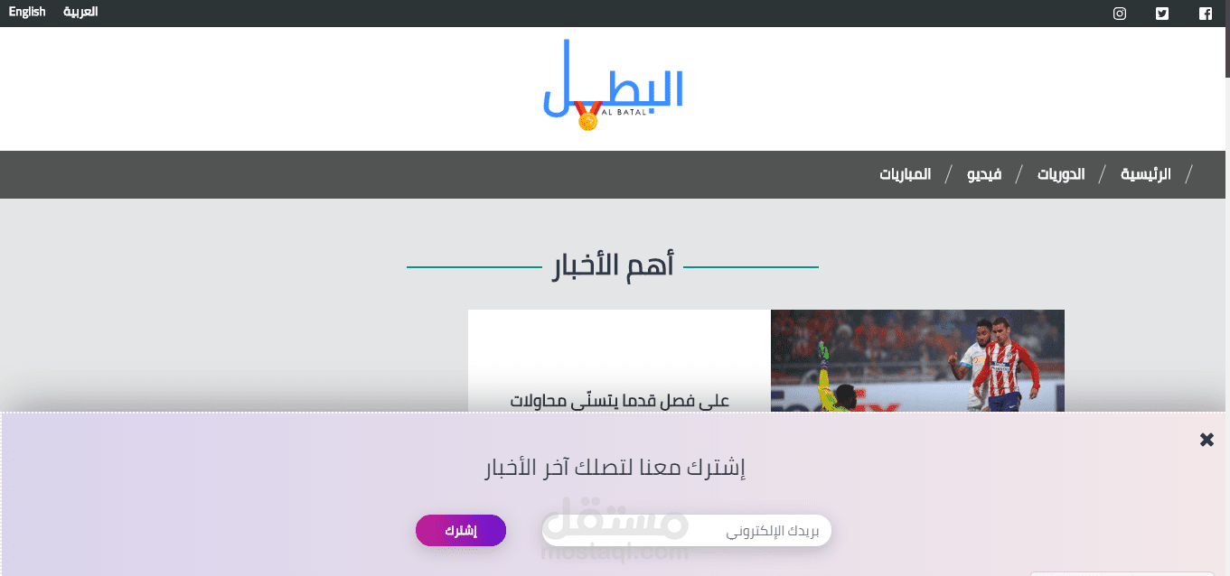 مشروع موقع إخباري رياضي بلغتين منجز بواسطة Laravel و Vue.js، متوافق مع الهواتف النقالة و يحتوي على back-office لإدارة الموقع.