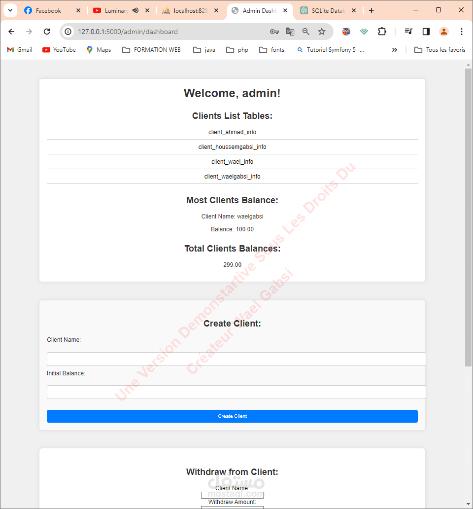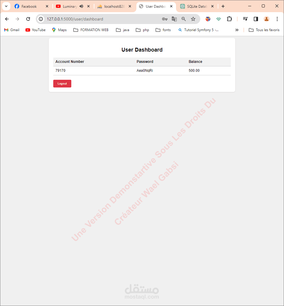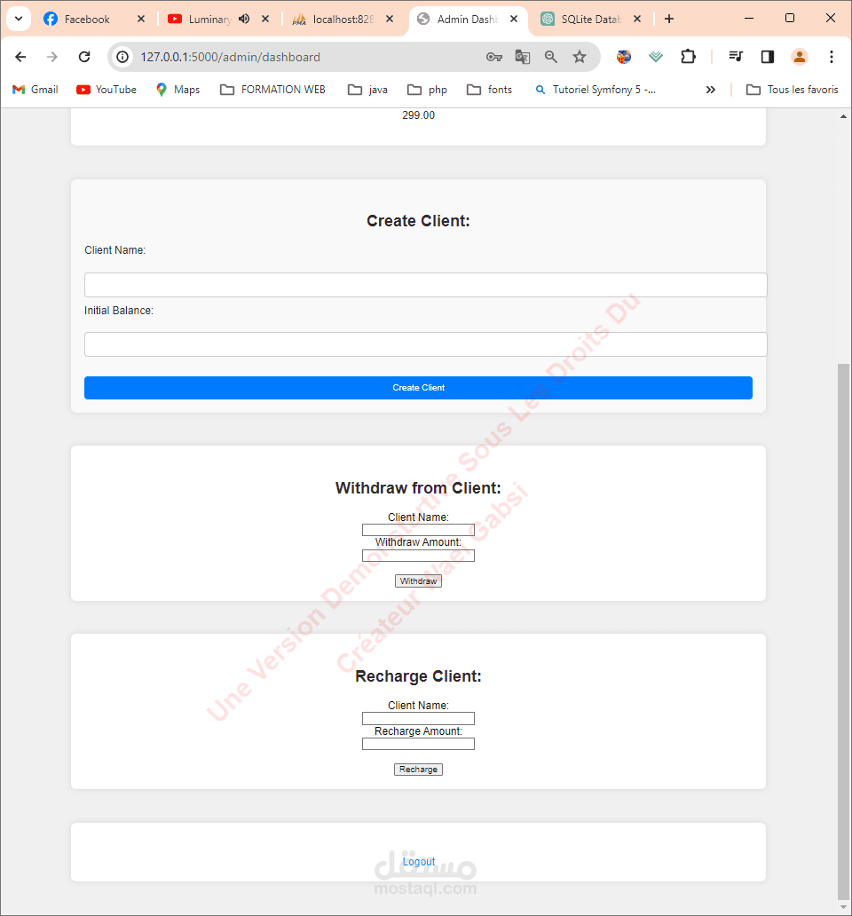 التقنيات المستخدمة: Flask: يستخدم Flask كإطار عمل ويب لمعالجة طلبات HTTP والاستجابات. SQLite: يستخدم SQLite كنظام إدارة قواعد البيانات لتخزين بيانات المستخدم وسجلات العمليات. HTML/CSS: يستخدم HTML وCSS لإنشاء واجهة المستخدم للوحة المعلومات. JavaScript (jQuery): يستخدم jQuery لمعالجة إرسالات النماذج بشكل غير متزامن وتلاعب DOM.
