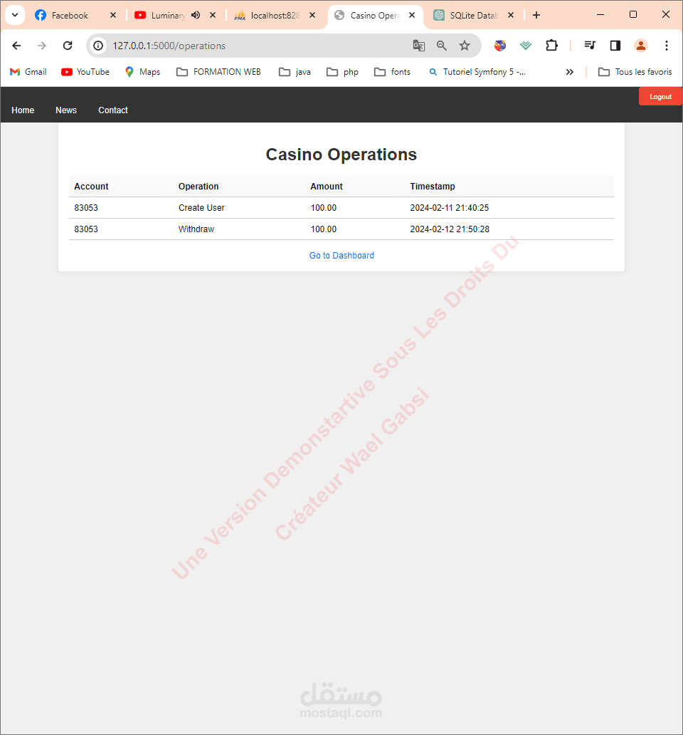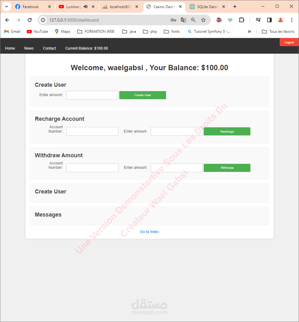 نظام إدارة الكازينو هذا المشروع هو نظام إدارة كازينو بسيط يعتمد على الويب تم بناؤه باستخدام Flask وSQLite وHTML/CSS. يتيح للمستخدمين إنشاء حساباتهم، وشحن رصيدهم، وسحب الأموال. كما يقوم النظام بتسجيل جميع العمليات التي يقوم بها المستخدمون.