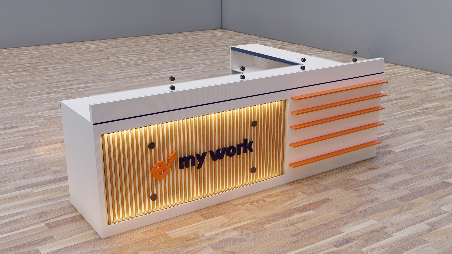 For textures and materials, a mixture of glass and wood was used, with harmonious color coordination such as blue, orange and white, which are the colors that belong to the office’s visual identity.