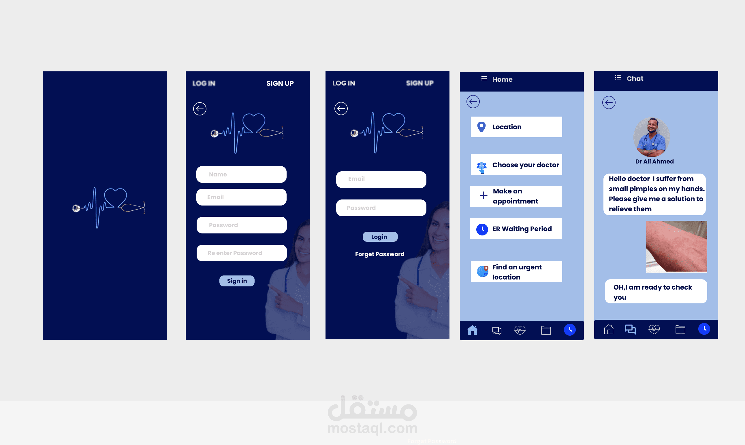 تصميم تطبيق حجز طبيب حيث يتضمن صفحات تسجيل الدخول وثم بعد ذلك تقوم بحجز الدكتور وتقوم بمحادثته