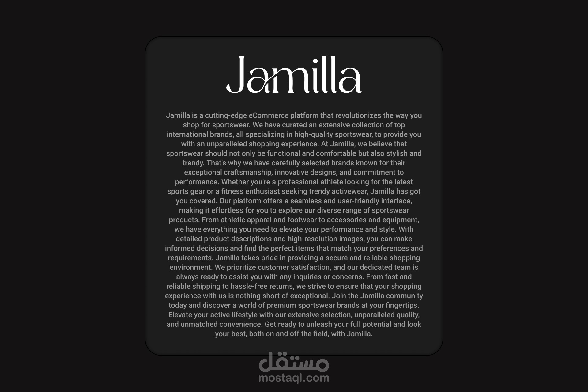 Jamilla is a cutting-edge eCommerce platform that revolutionizes the way you shop for sportswear. We have curated an extensive collection of top international brands, all specializing in high-quality sportswear, to provide you with an unparalleled shopping experience. At Jamilla, we believe that sportswear should not only be functional and comfortable but also stylish and trendy. That's why we have carefully selected brands known for their exceptional craftsmanship, innovative designs, and commitment to performance. Whether you're a professional athlete looking for the latest sports gear or a fitness enthusiast seeking trendy activewear, Jamilla has got you covered. Our platform offers a seamless and user-friendly interface, making it effortless for you to explore our diverse range of sportswear products. From athletic apparel and footwear to accessories and equipment, we have everything you need to elevate your performance and style. With detailed product descriptions and high-resolution images, you can make informed decisions and find the perfect items that match your preferences and requirements. Jamilla takes pride in providing a secure and reliable shopping environment. We prioritize customer satisfaction, and our dedicated team is always ready to assist you with any inquiries or concerns. From fast and reliable shipping to hassle-free returns, we strive to ensure that your shopping experience with us is nothing short of exceptional. Join the Jamilla community today and discover a world of premium sportswear brands at your fingertips. Elevate your active lifestyle with our extensive selection, unparalleled quality, and unmatched convenience. Get ready to unleash your full potential and look your best, both on and off the field, with Jamilla.