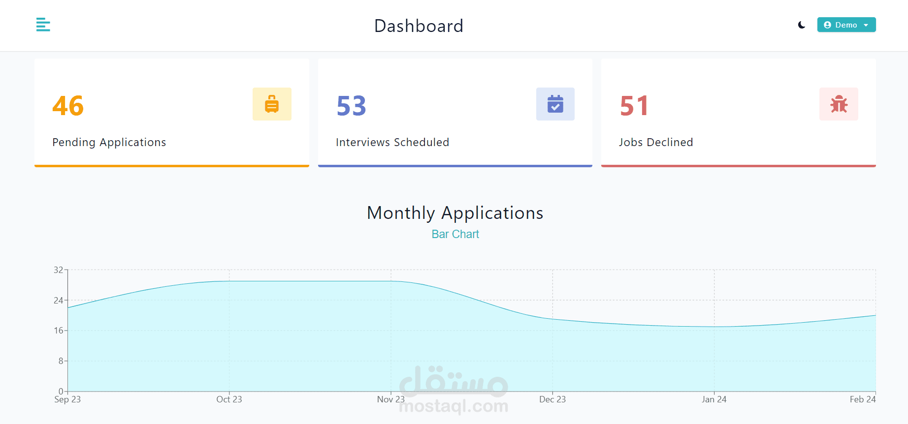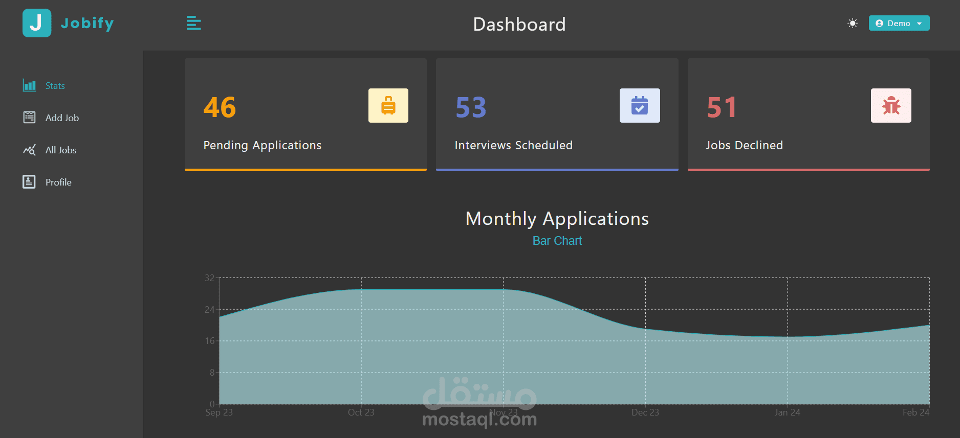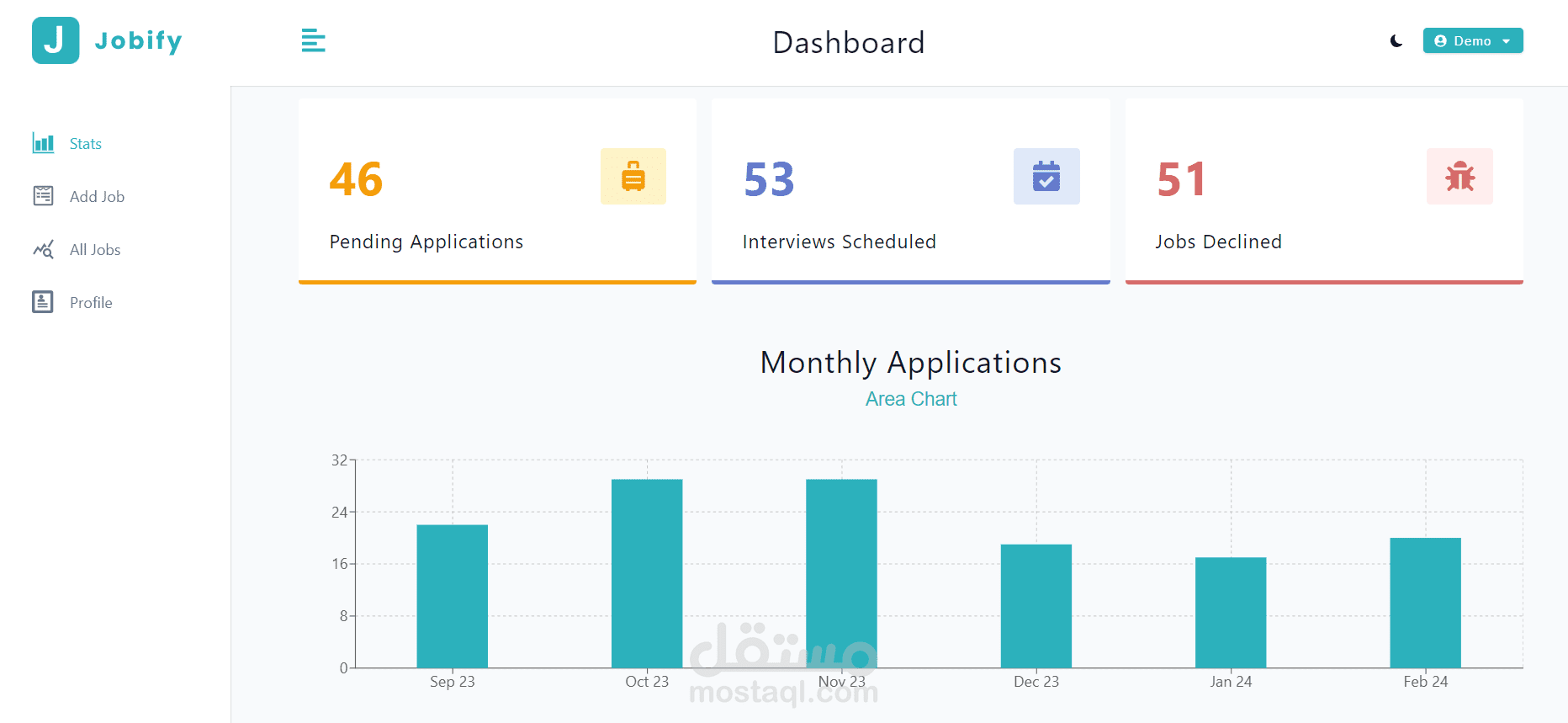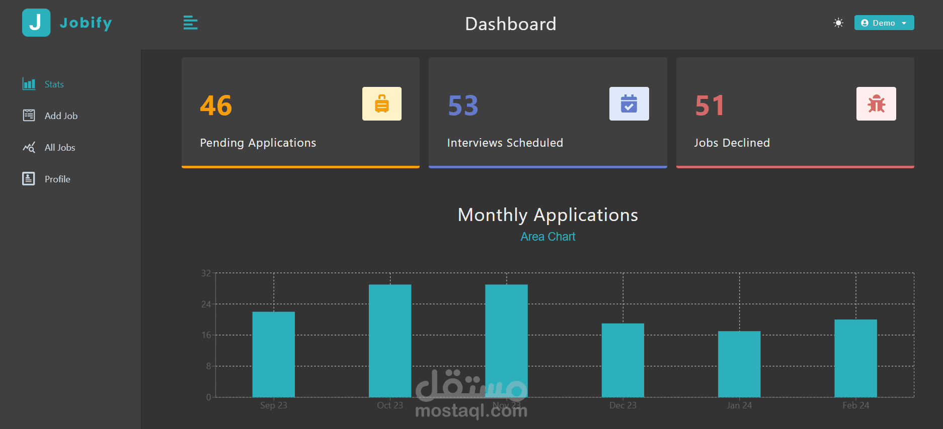 Dashboard: The application provides a dashboard with bar and area charts to visualize job application statistics.