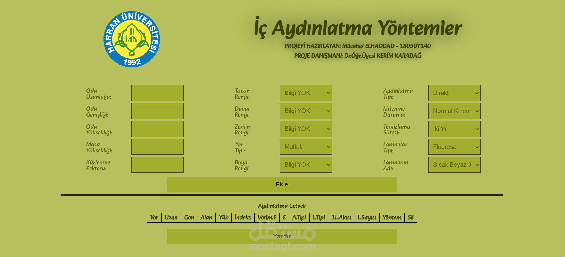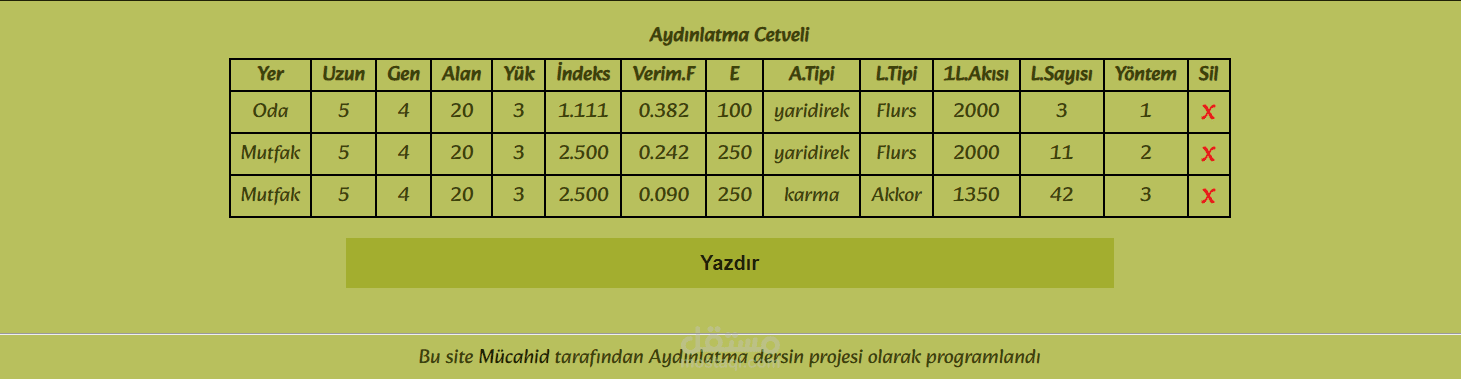 Description: A project programmed at the request of the professor of electrical lighting, according to his customized requests and according to the lighting schedules approved in Turkey. The number of bulbs required to ideally illuminate the place is calculated using 3 different methods according to the type of data and in proportion to the type of bulb used.