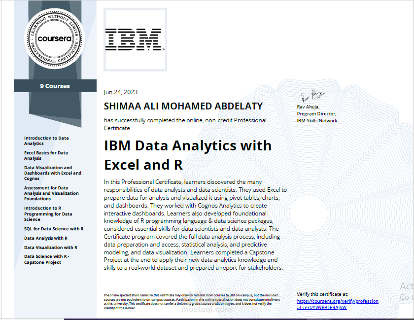شهادة IBM فى تحليل البيانات باستخدام لغة R و Excel و SQL و IBM Cognos