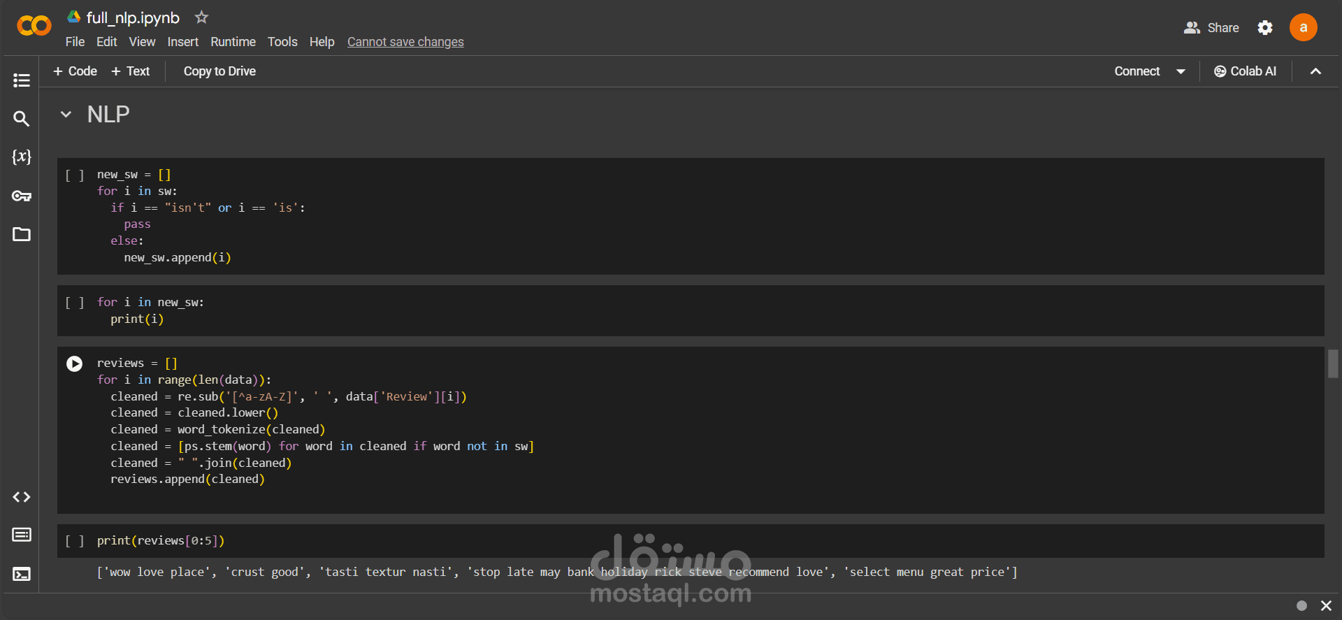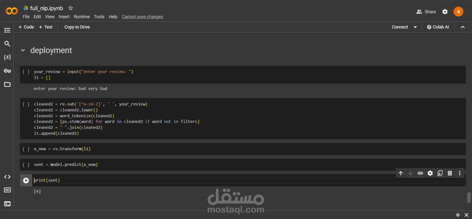 هذا النهج المبسط يوضح الخطوات الرئيسية المتضمنة في تطوير مشروع NLP لتحليل المشاعر في تقييمات المطاعم.