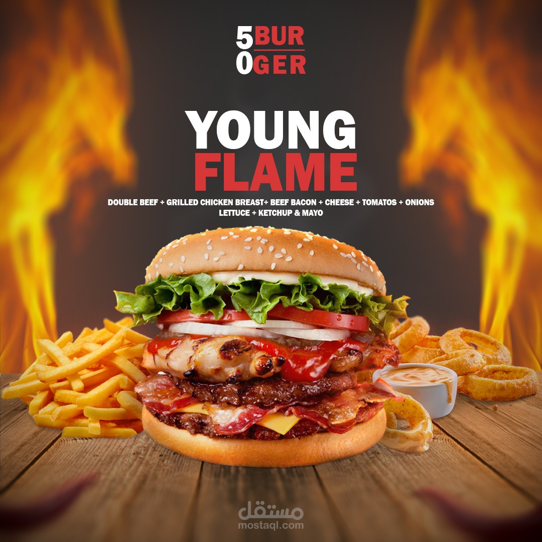 1. **تصميم شطيرة البرغر:** صممنا تصميمًا ديناميكيًا وشهيًا لساندويتش البرغر في المطعم، باستخدام ألوان زاهية ورسومات لذيذة للمكونات وخطوط نصية واضحة لتسليط الضوء على مكونات الساندويتش. ينقل التصميم بفعالية لذة وجودة البرغر، مما يحث الزبائن على التذوق.