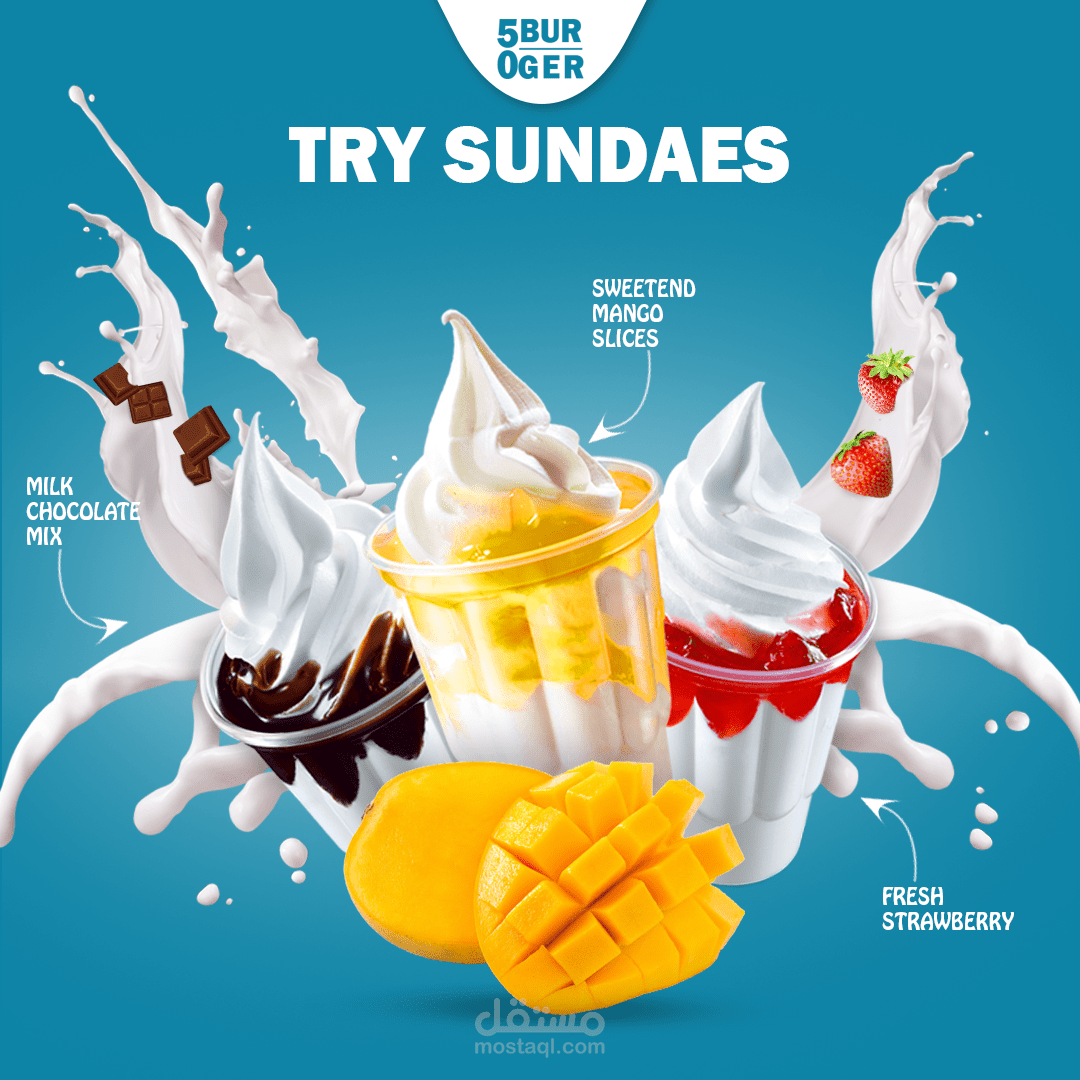 2. **تصميم نكهات الآيس كريم للسانداي:** لنكهات الآيس كريم للسانداي، قمنا بتطوير تصميم لعبوي ومغري يعرض تنوع وفاخرية عروض الآيس كريم في المطعم. باستخدام مجموعة من التأثيرات الملونة والمغرية ، يلتقط التصميم جوهر كل نكهة بشكل ممتاز، مما يجعله لا يقاوم لعشاق الآيس كريم من جميع الأعمار.