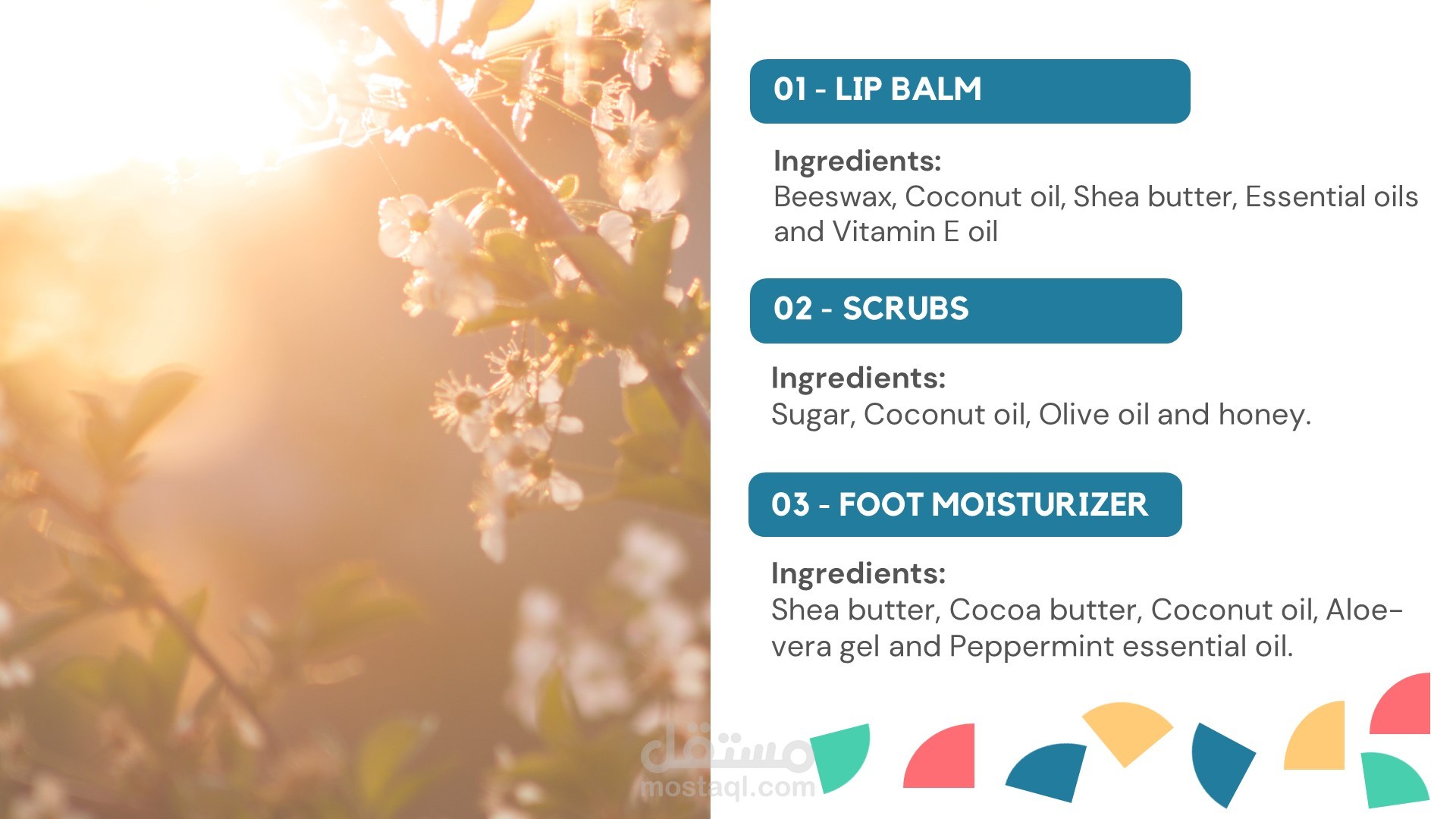 العرض التقديمي يقدم نظرة شاملة عن منتجات طبيعية وصديقة للبيئة في مجال صناعة مستحضرات التجميل المنزلية.