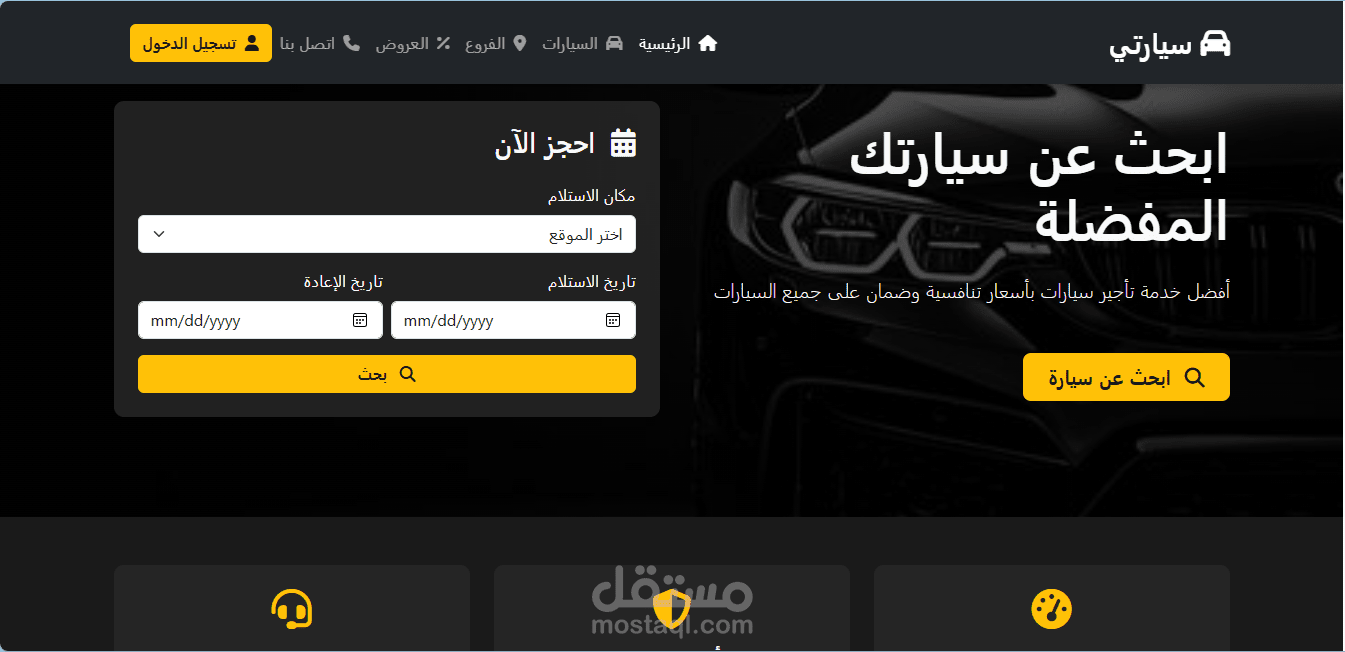 يقدّم مشروع سيّارتي واجهة مستخدم Front-End كاملة مصممة لموقع خدمات تأجير السيارات، وتم تطويرها باستخدام HTML وCSS فقط.