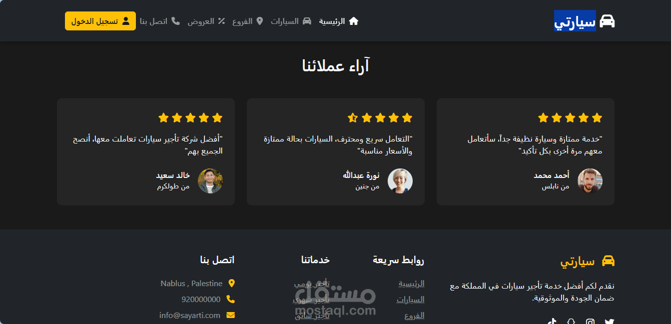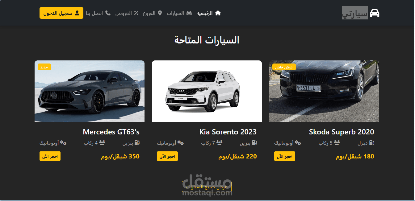شريط تنقّل يحتوي على: الرئيسية، السيارات، الفروع، العروض، التواصل