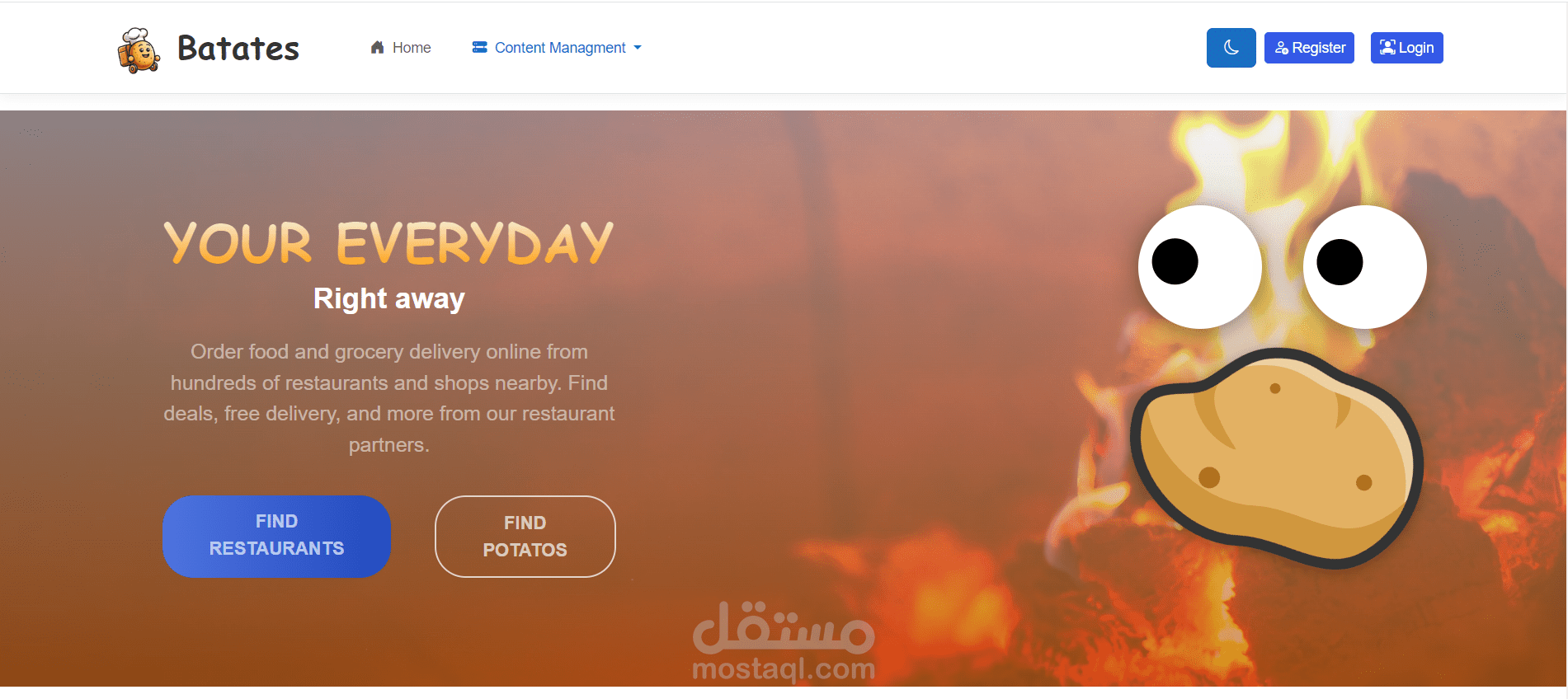 هو موقع لعرض قائمة من المطاعم .. ويمكنك الدخول لكل مطعم ورؤية كل المحتوي الذي يقدمة ويمكنك اختيار الطلب الذي تريده من اي مطعم تريده , وقد ساهمت في انشاء هذا الموقع حيث انني أنشات Dark-Light Mode وأنشات ايضا صفحة ال Home وصفحة ال Register وصفحة ال Log in كما أنشات صفحة manage your account حيث من خلالها يمكنك التعديل علي اميلك الشخصي كما انشأت صفحة ال كارت حيث يمكنك اذافه او حذف وجبات وجميع الصور المرفقة هو من انشائي الشخصي