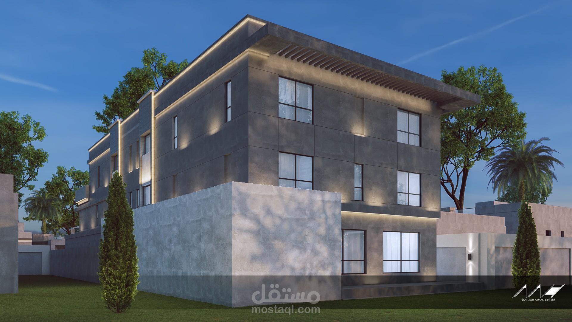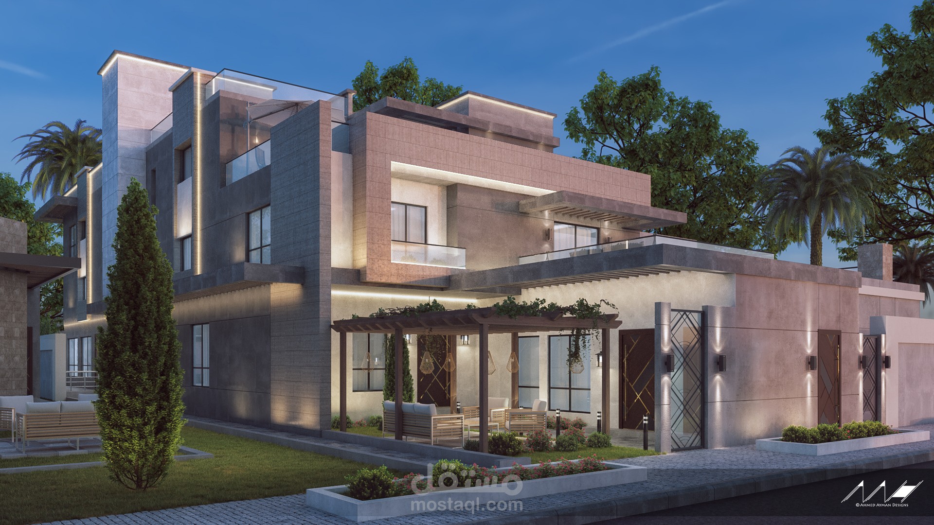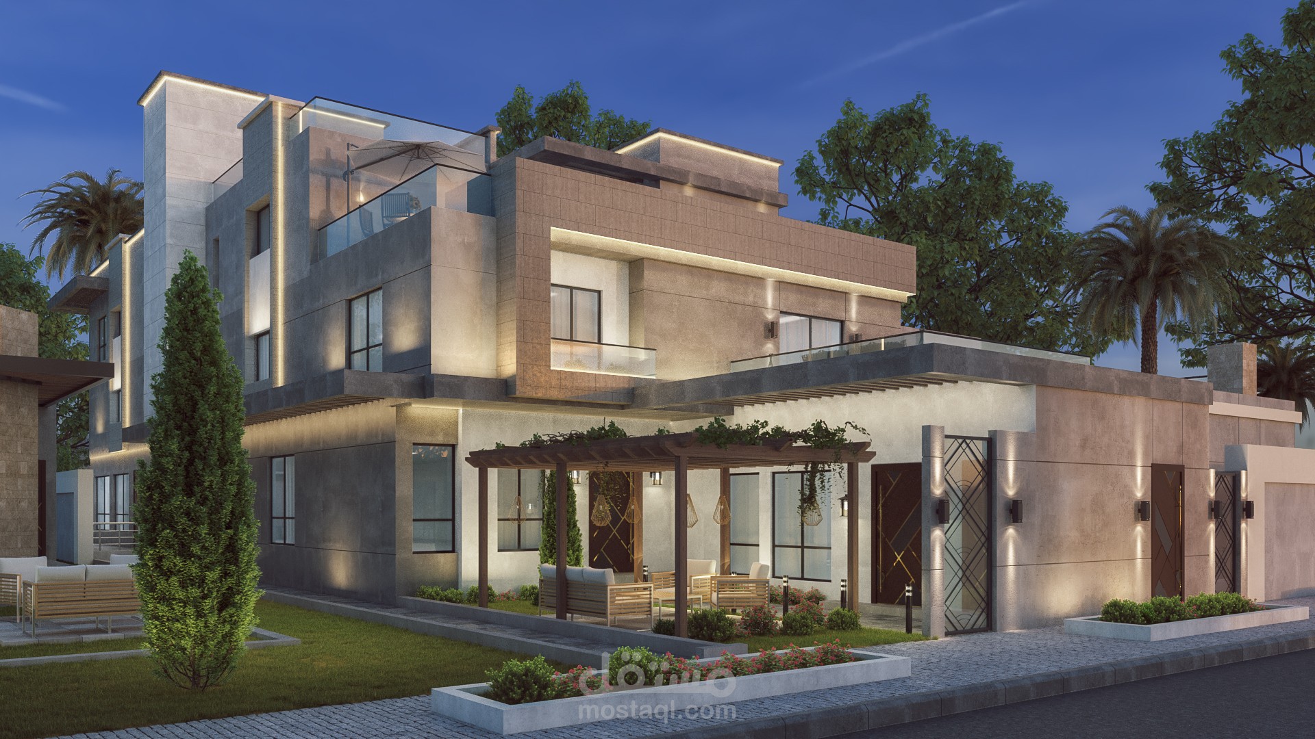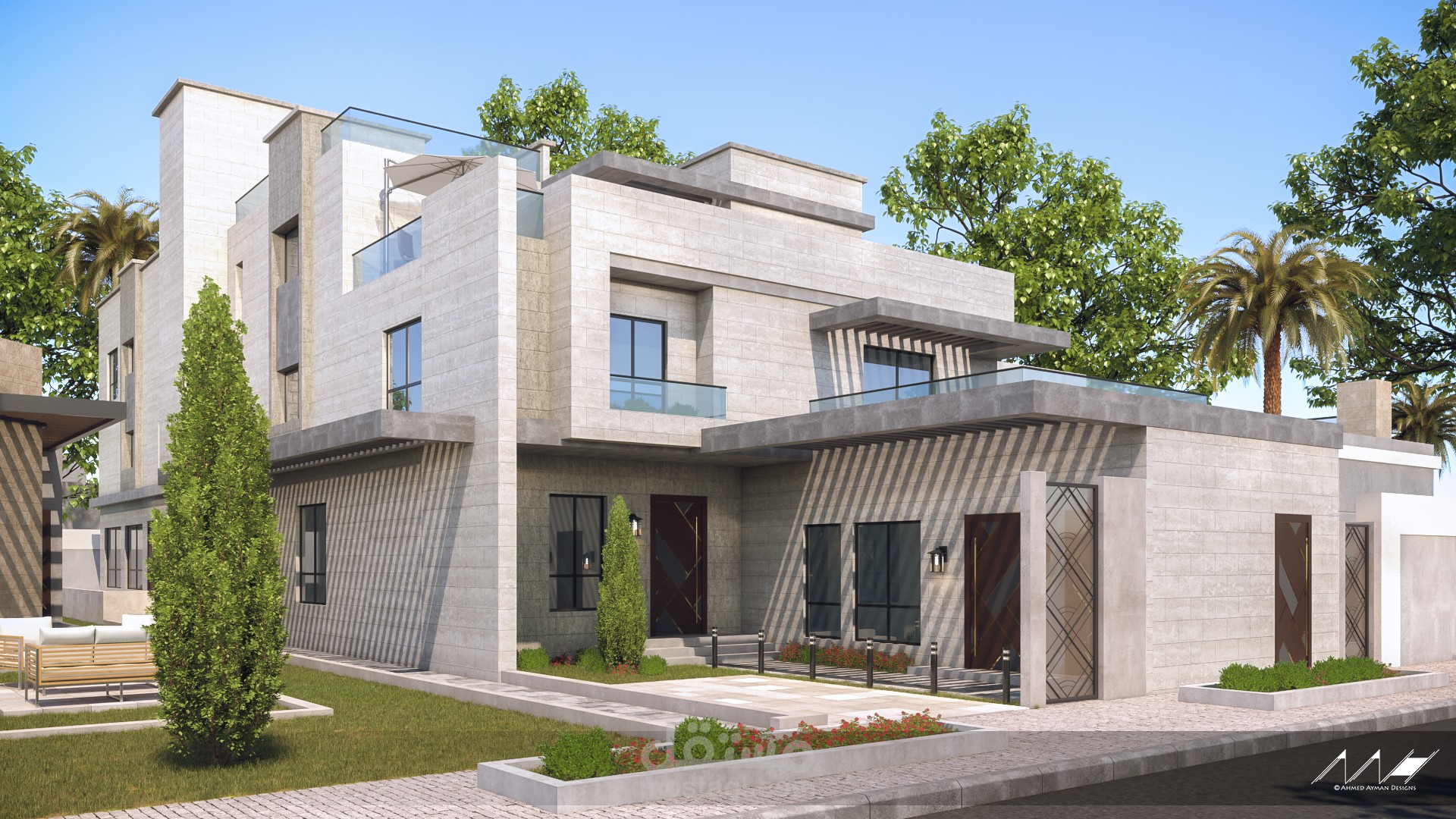 تصميم واجهة علي استايل modern ل فيلا بالمملكة العربية السعودية مع تصميم بسيط للجلسة الخارجية.