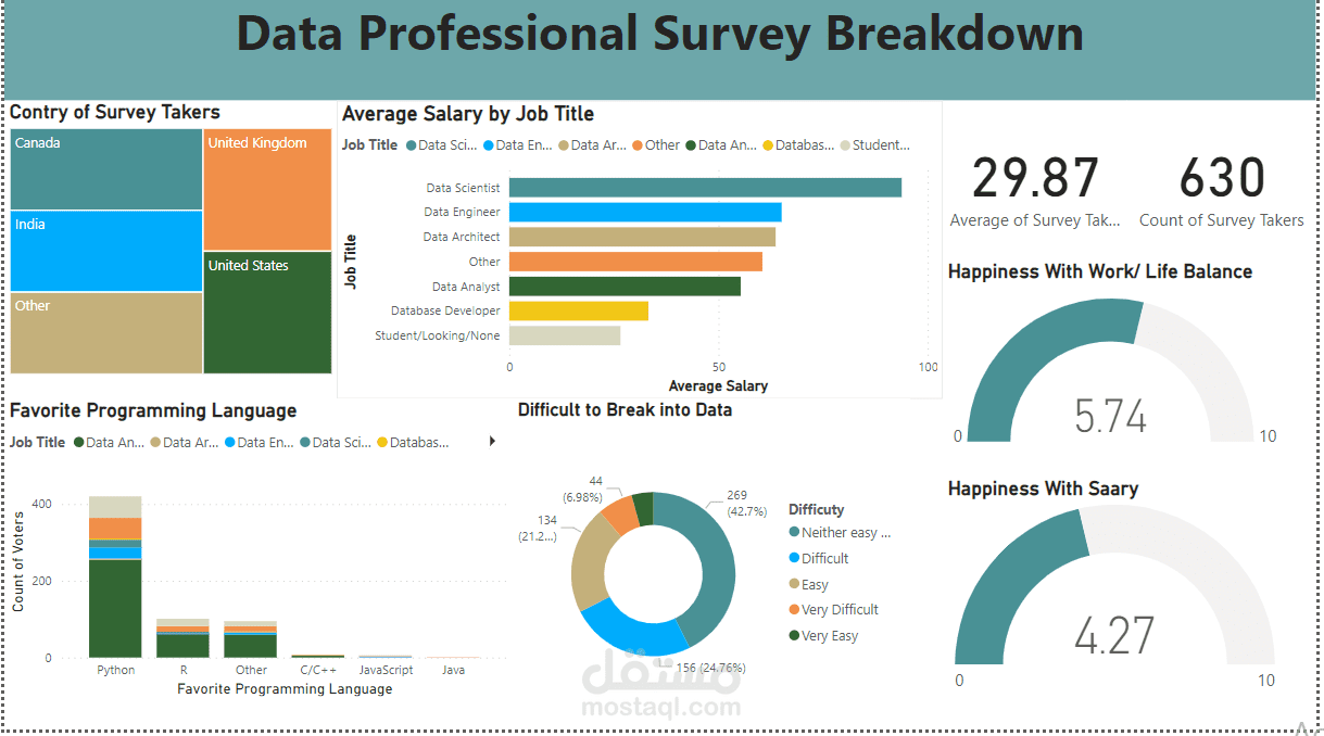 تحليل مجموعة بيانات عن استطلاع الرئ حول العمل , وذلك تم بستخدام مهارة Power BI لعمل تحليل وتنظيف البيانات وانشاء Dashboard تسهيليه.