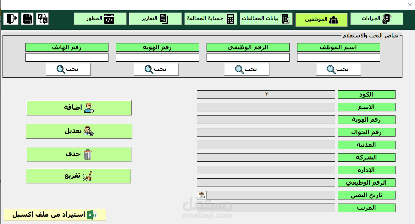 - من هذه النافذة يتم تسجيل وتعديل وحذف بيانات الموظفين