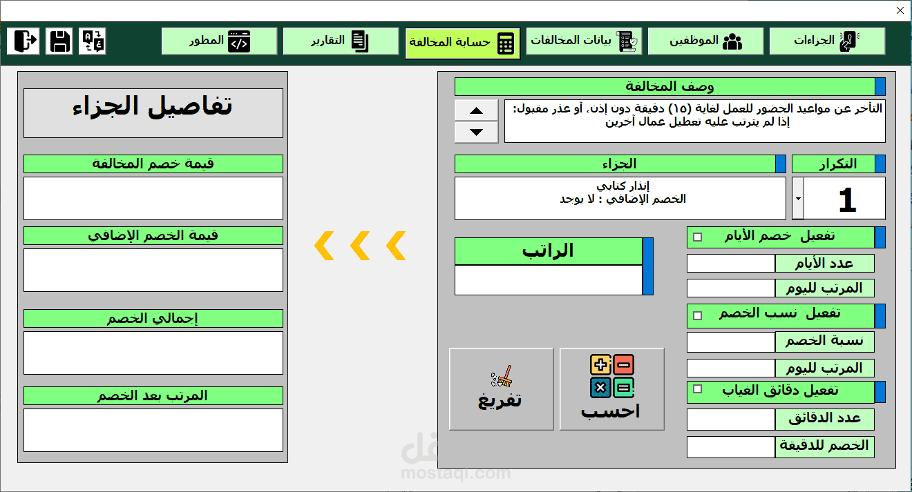 وكذلك بمجرد كتابة الرقم الوظيفي واختيار المخالفة وادخال تاريخها يتم حساب عدد مرات تكرارها بشكل اتوماتيك وبناءاً عليها يظهر الجزء