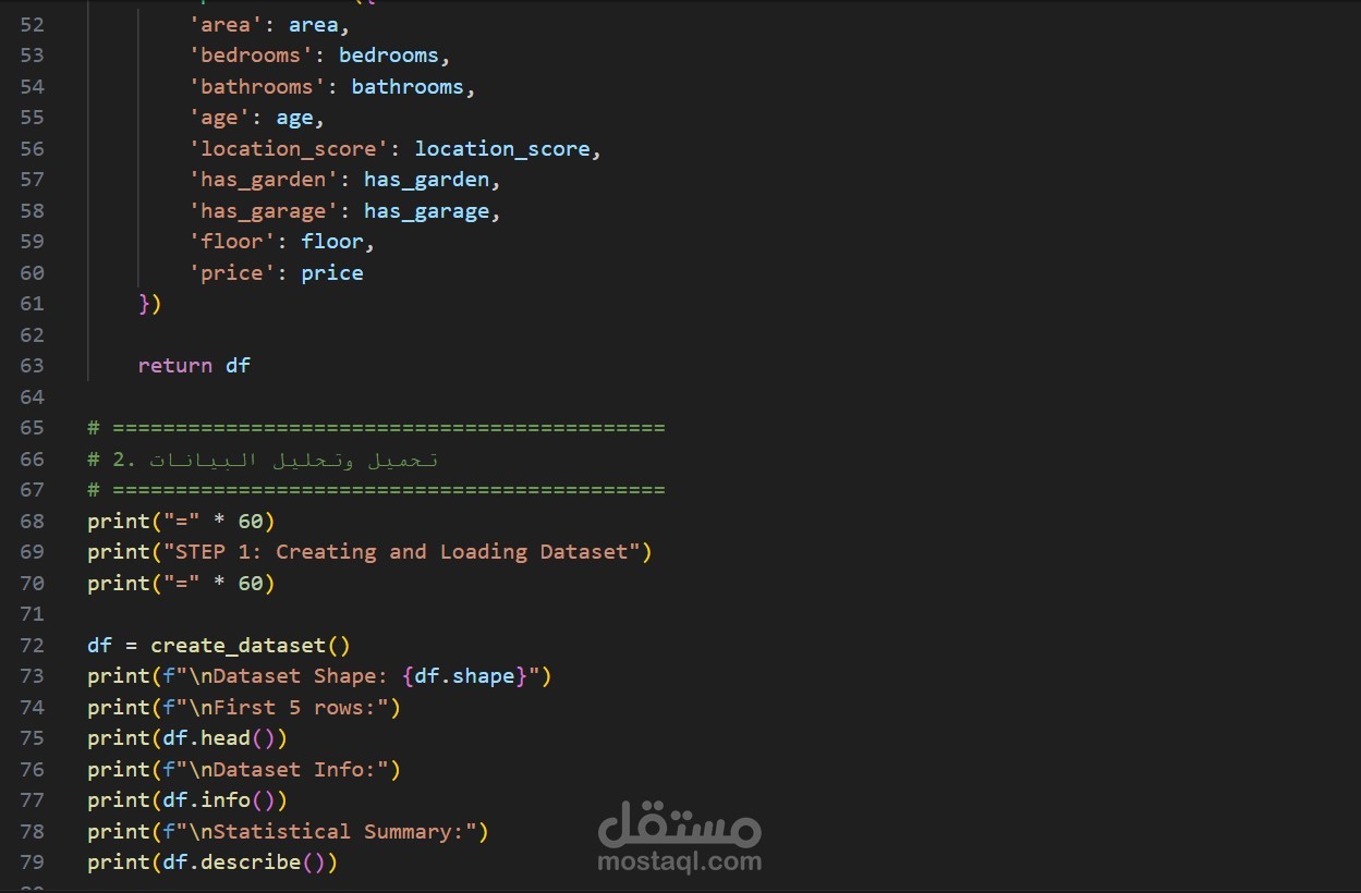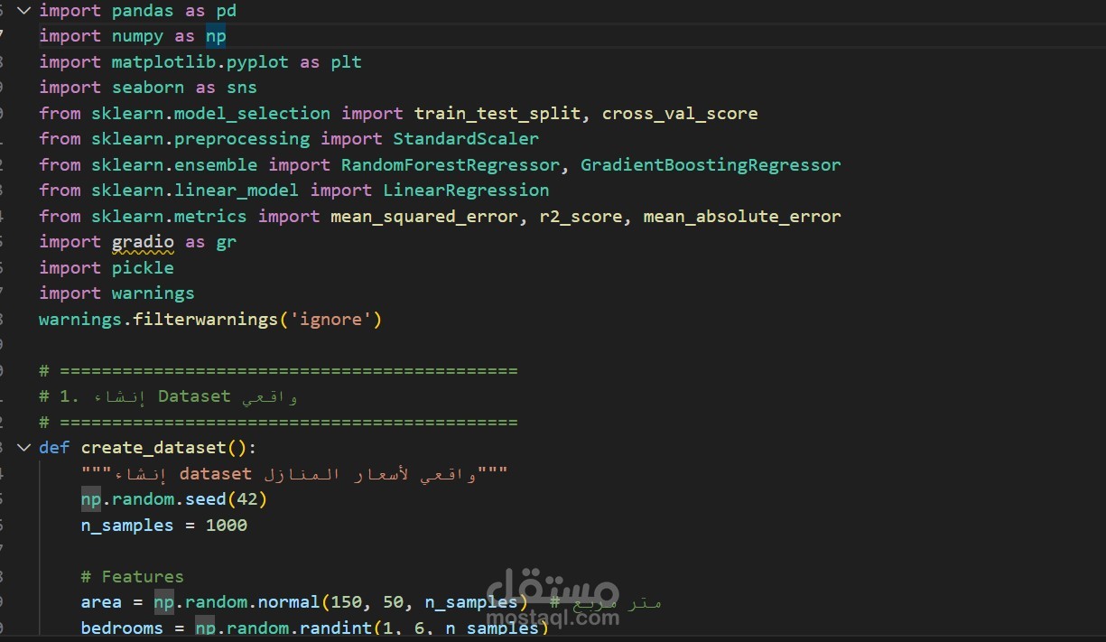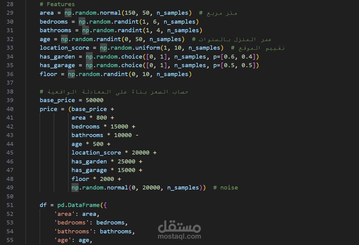 - إنشاء dataset واقعي يحتوي على 1000 عينة