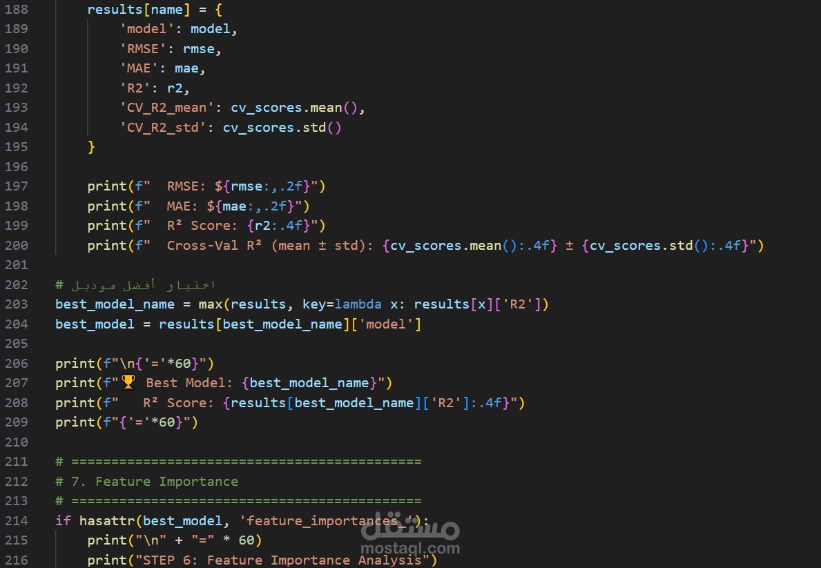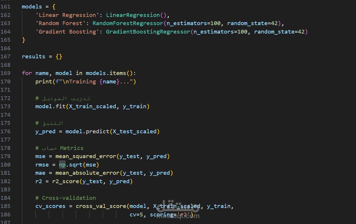 - مقارنة الأداء باستخدام مقاييس متعددة (RMSE, MAE, R²)