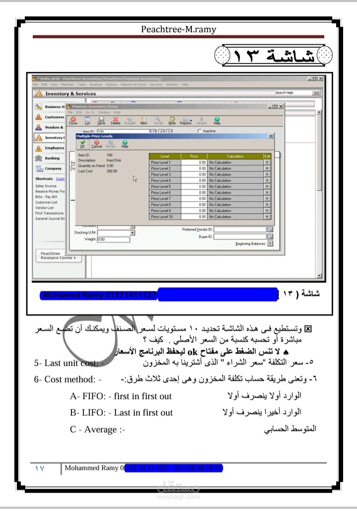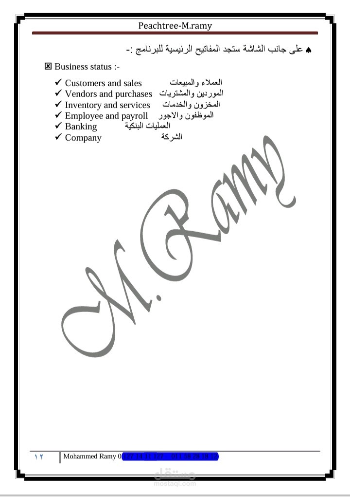 كتاب شارح لبرنامج peachtree المحاسبي، من بداية التهيئة وإدخال بيانات الشركة للبرنامج، ومرورا بكل مراحل تسجيل الأصناف والمخزون، تسجيل الموردين ودورة الشراء، تسجيل العملاء ودورة المبيعات ... الخ
