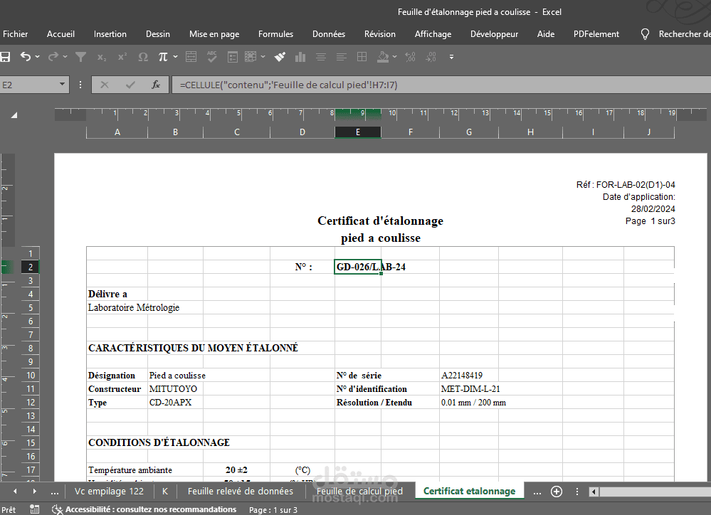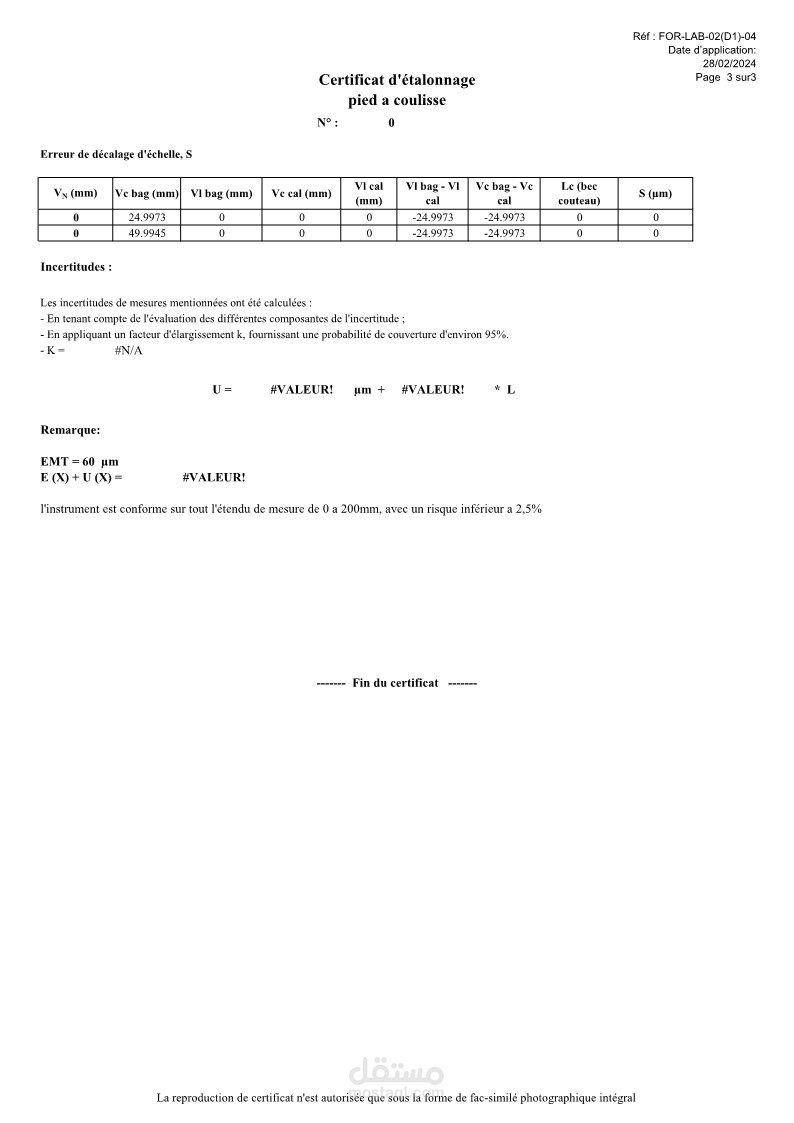 (Certificat d'étalonnage) شهادة المعايرة هي التقرير النهائي، وتلخص وتستخدم البيانات المحسوبة بواسطة جدول البيانات في برنامج Excel