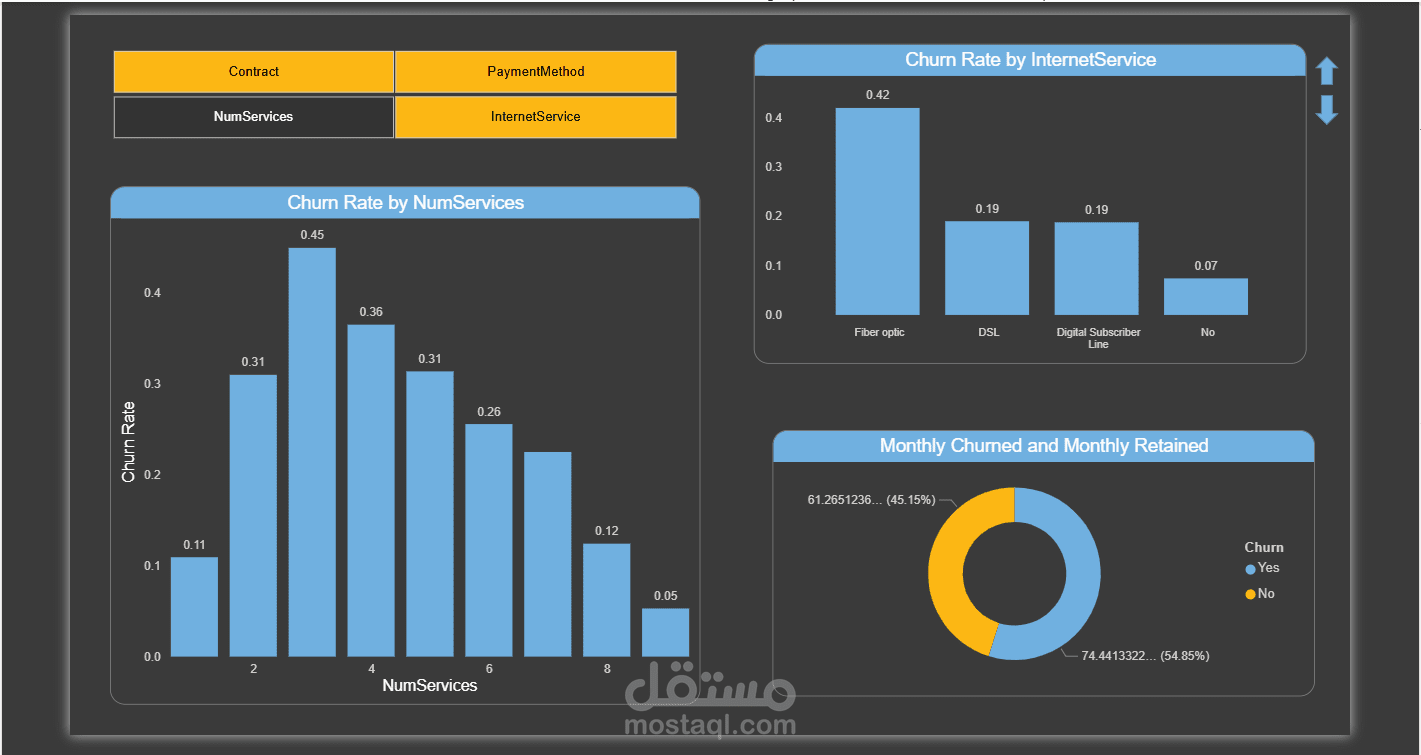 - Churn Rate = DIVIDE(CALCULATE(COUNTROWS(CustomerTable), CustomerTable[Churn]="Yes"), COUNTROWS(CustomerTable))