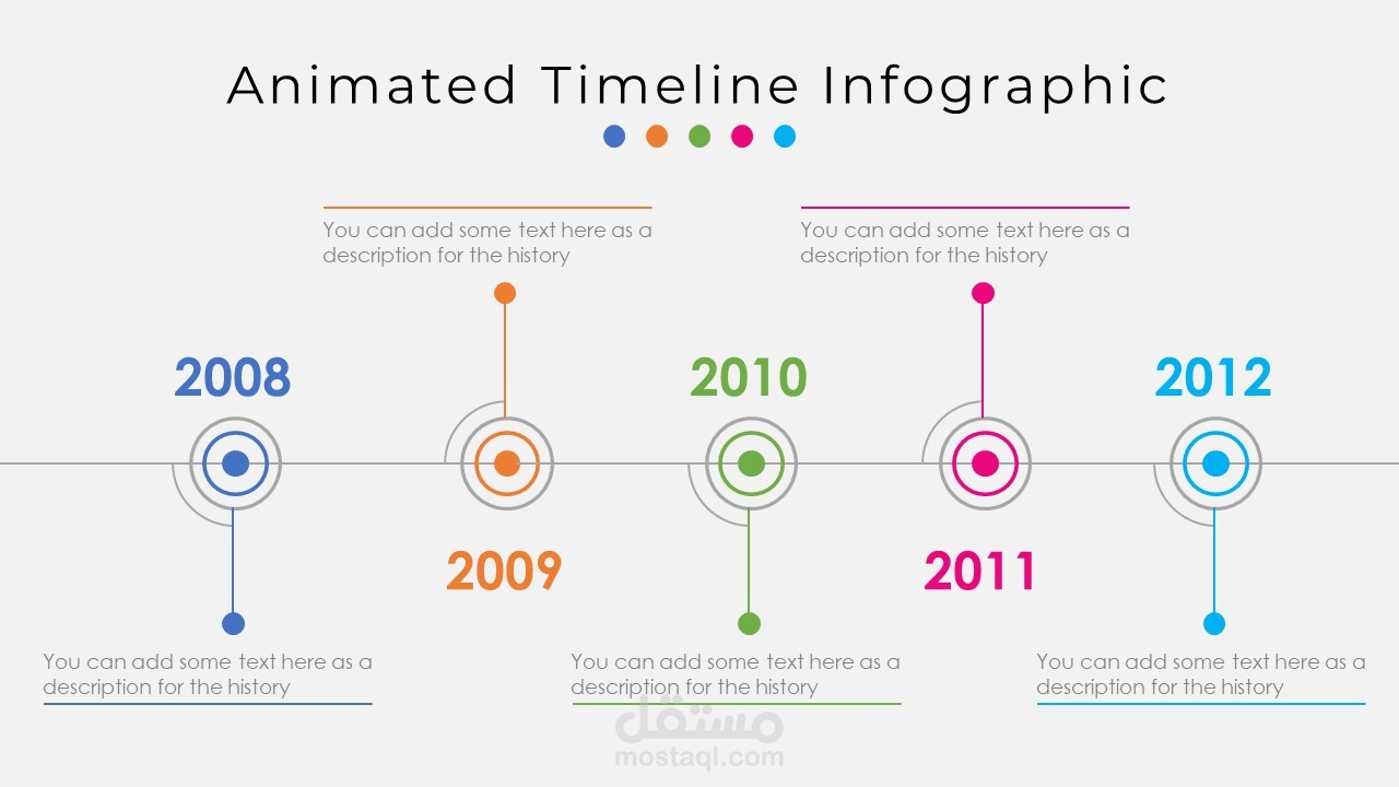 في هذا العمل تم عمل تايم لاين متحرك يمكن من خلاله عرض تسلسل زمني لأي مجموعة من الخطوات أو الأحداث الزمنية بشكل مرتب وشيق وإحترافي مع امكانية تعديل الخلفية والأولوان والنصوص واللغة و عمل أي عدد من البنود