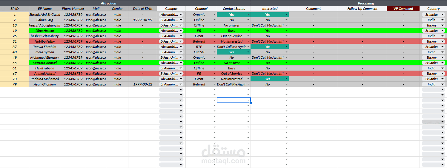الغرض: الجدول الإلكتروني يعمل كأداة لإدارة علاقات العملاء (CRM). يساعد في إدارة وتنظيم البيانات المتعلقة بالعملاء المحتملين.