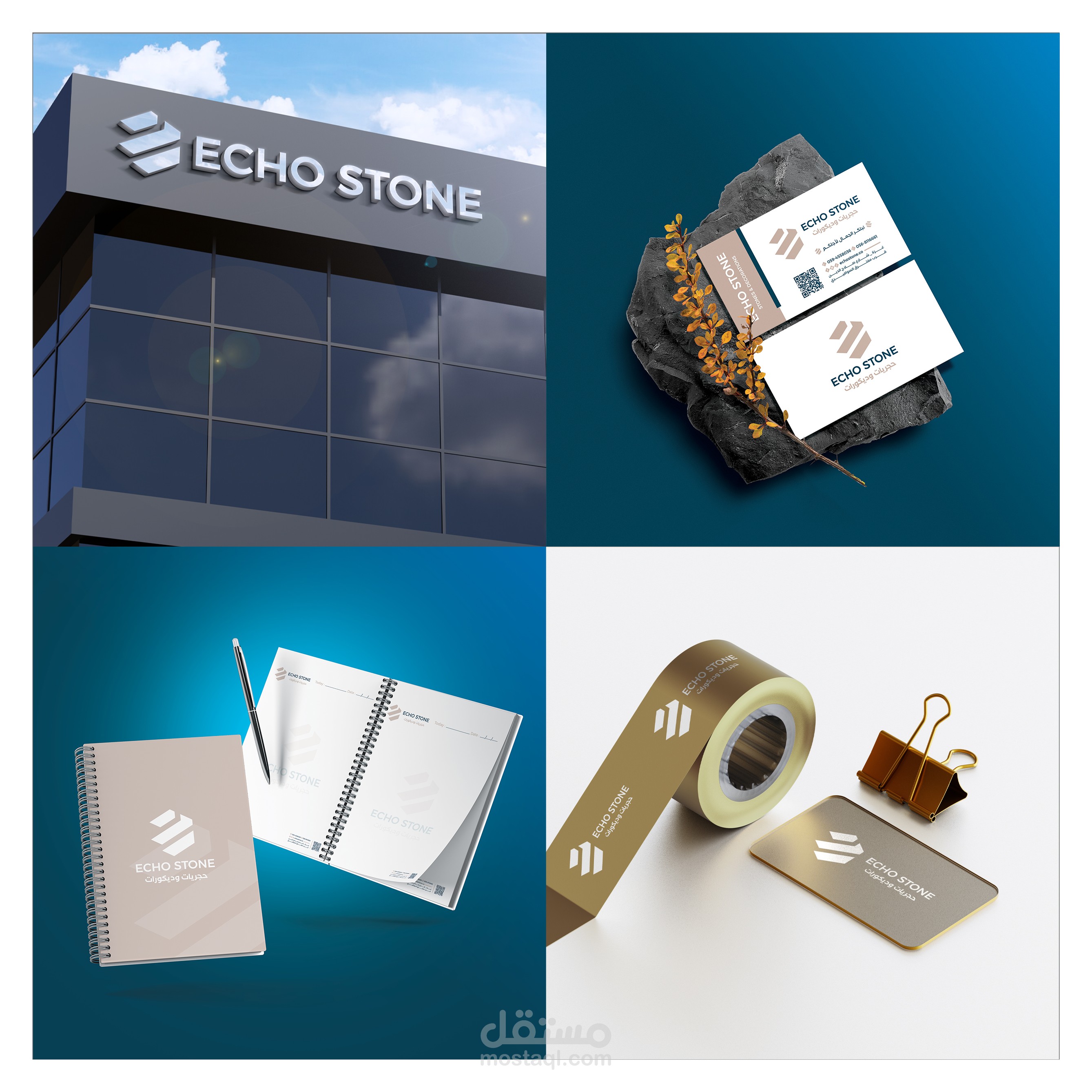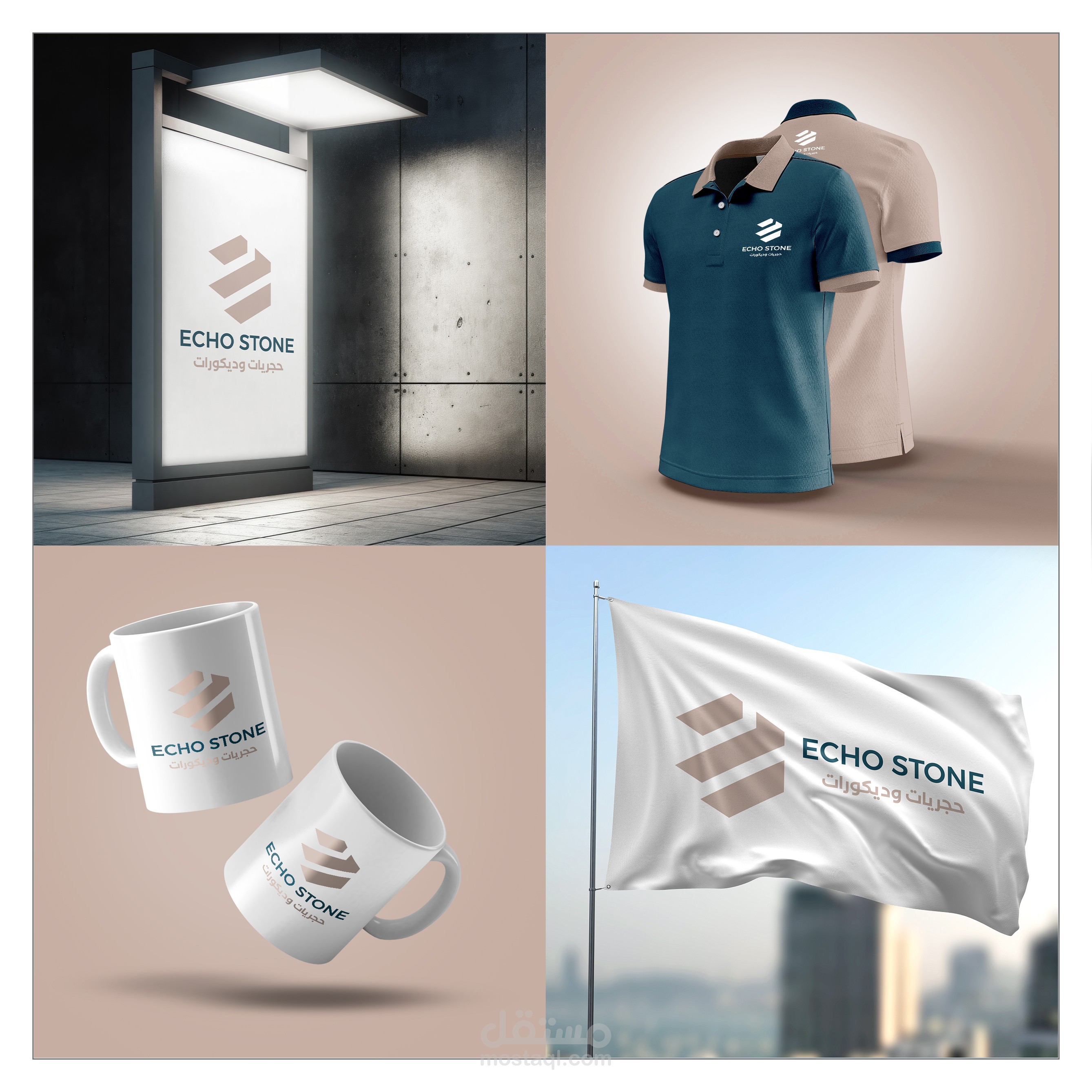 براند هوية بصرية لشركة echo stone للحجريات والديكورات تم انشاء الهوية حسب معاير وطبيعة العمل التي تقوم بها الشركة وتم الاتفاق مع العميل ع فكرة الشعار وكان يتضمن الفكرة التالية حرف الE من كلمة Echo , وحرف الS من كلمة stone وشكل تركيب الحجارة وزواياها والالوان وتم تطبيقها وونشرها