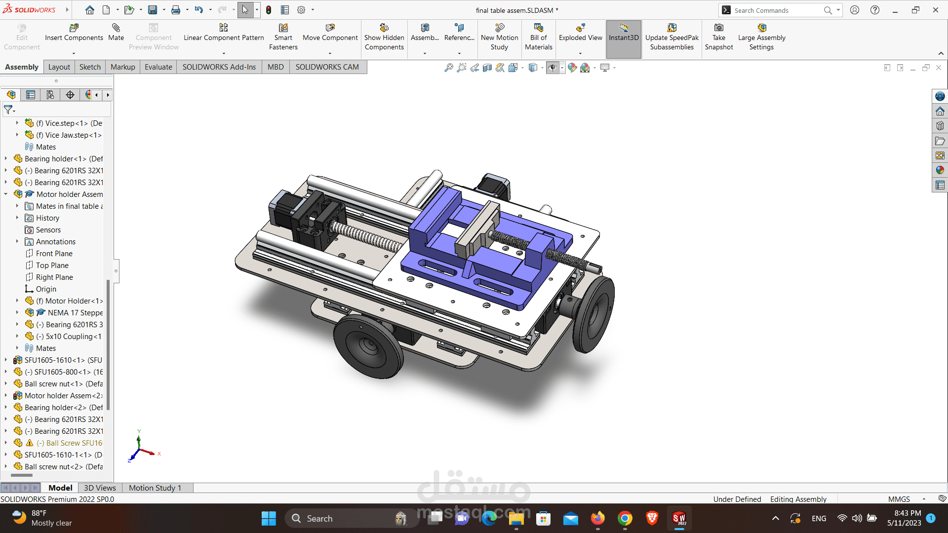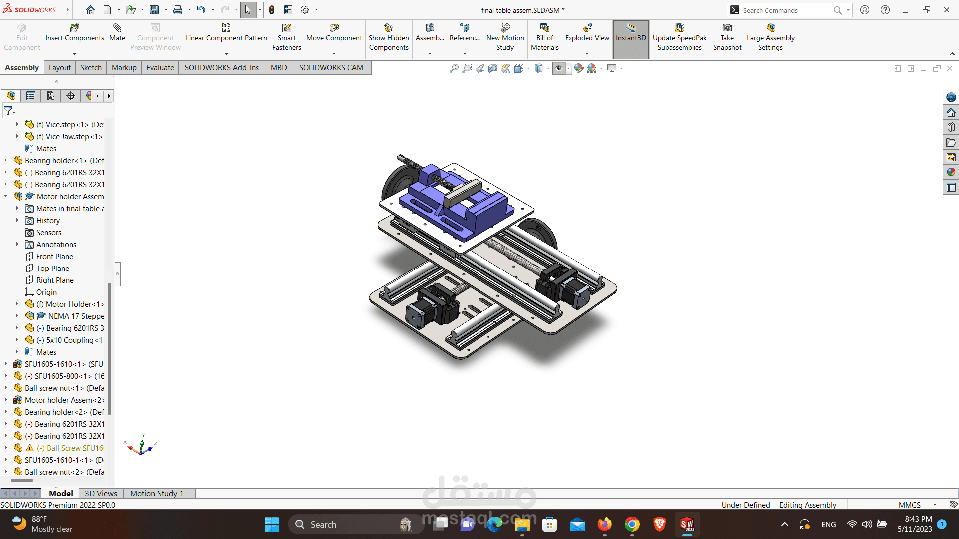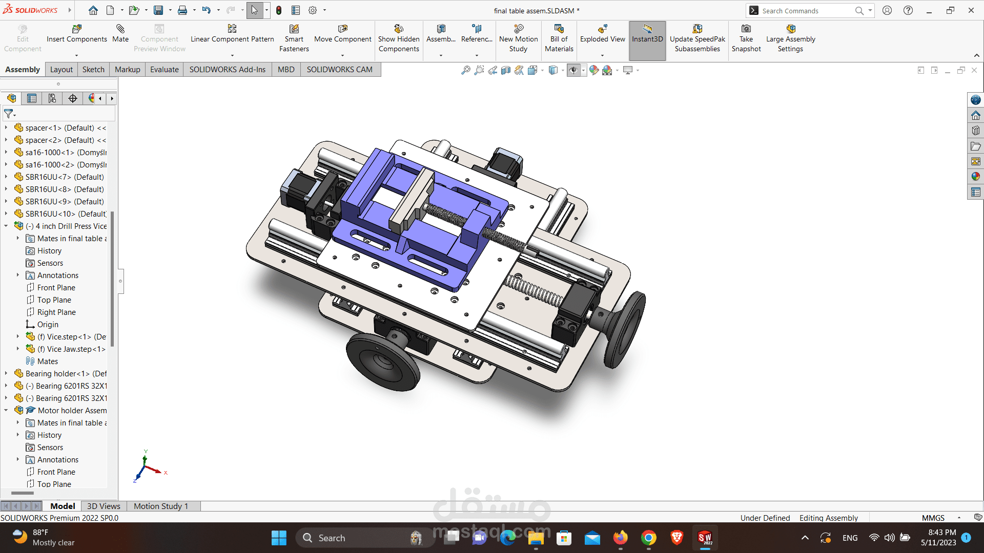 First the Semi Automatic_2-axis CNC table is designed and modeled on Solidworks and then the designed parts is manufactured using LASER cutting machine and conventional Lathe, then assembled in my LAB with the assembly steps and all the rails are mounted and caliprated with dial indicator. The system is designed to be used with two modes of operation ; manual withe the rollers and automatic with arduino based control . last but not least the software is designed to take coordinates from the user and convert them to stepper signals going to the stepper drivers.