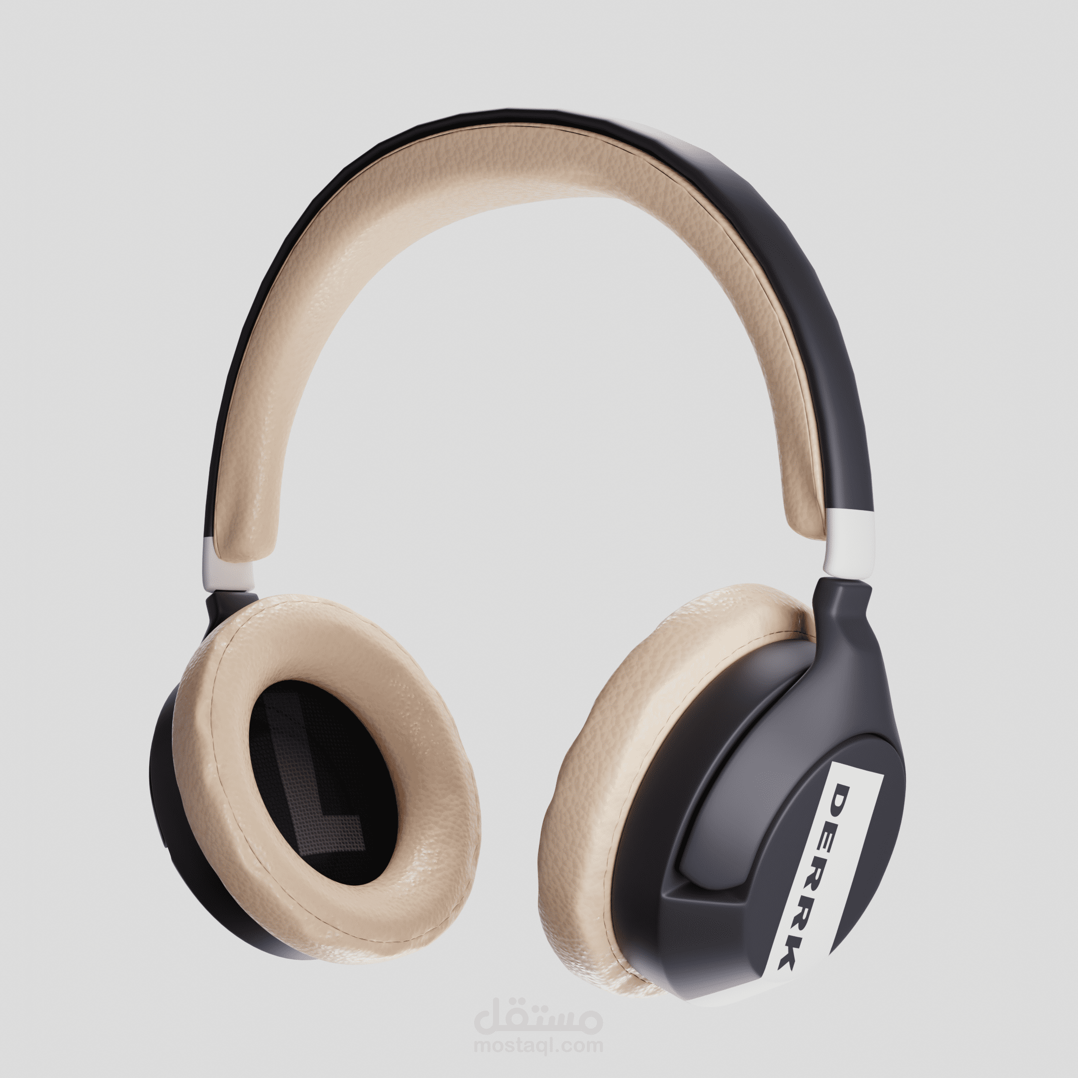 يقدم هذا التصميم ثلاثي الأبعاد لسماعة الرأس DERRK مزيجًا أنيقًا من الفخامة والراحة، حيث يتميز بهيكل أسود أنيق مدعوم بوسائد أذن وحشوة رأس بلون بيج ناعم، مما يعزز من تجربة الاستخدام المريحة. تبرز العلامة التجارية "DERRK" على الجانبين، مما يضفي لمسة احترافية على التصميم. تمثل هذه السماعة نموذجًا يجمع بين الحداثة والجودة، مع تفاصيل دقيقة تعكس الإتقان في التصميم الصناعي.