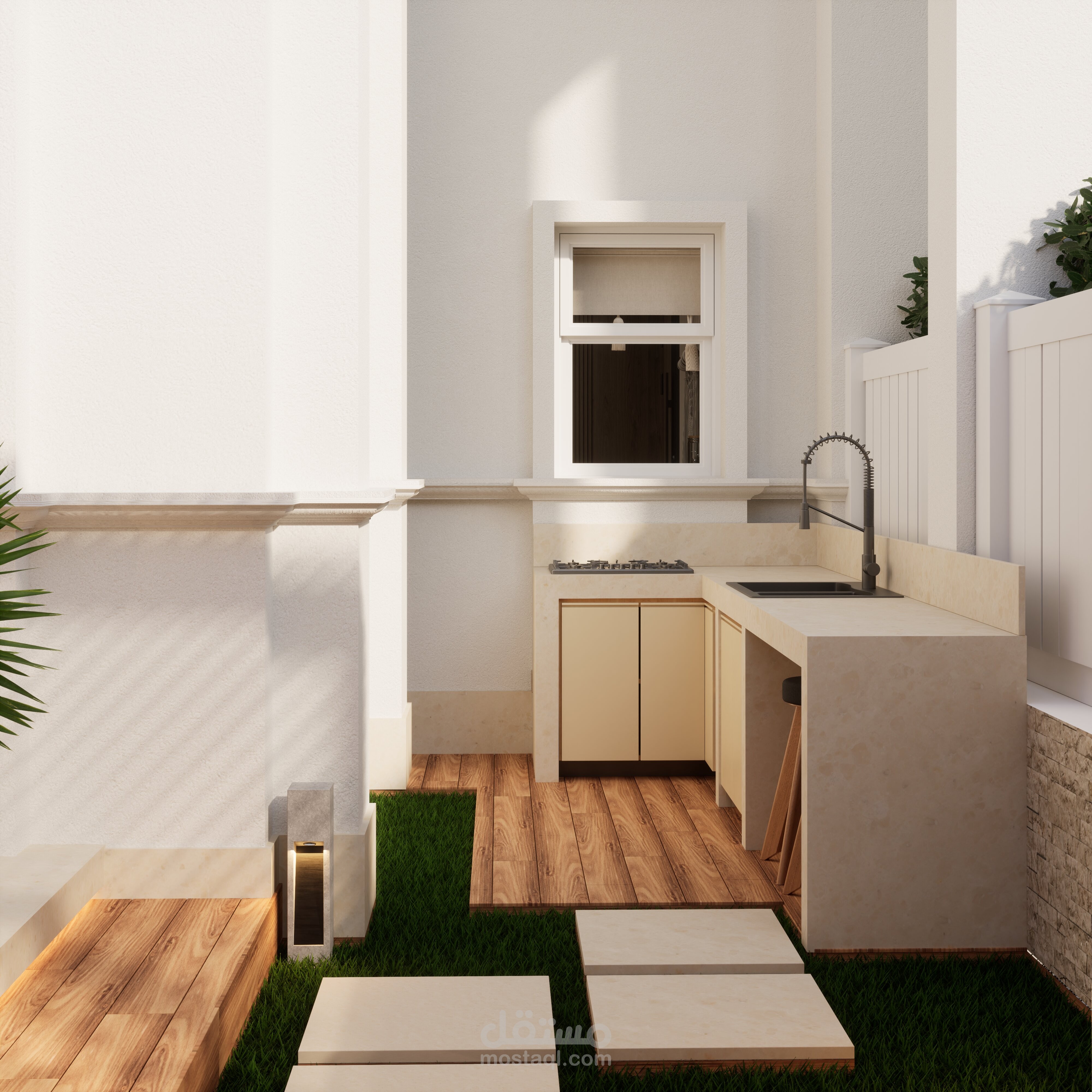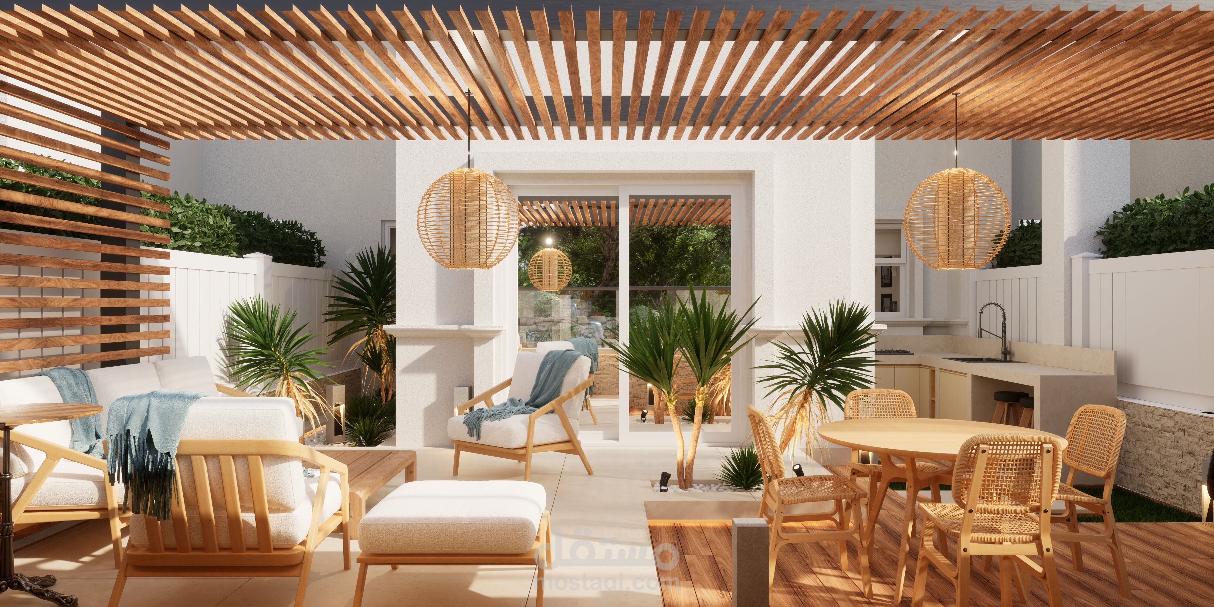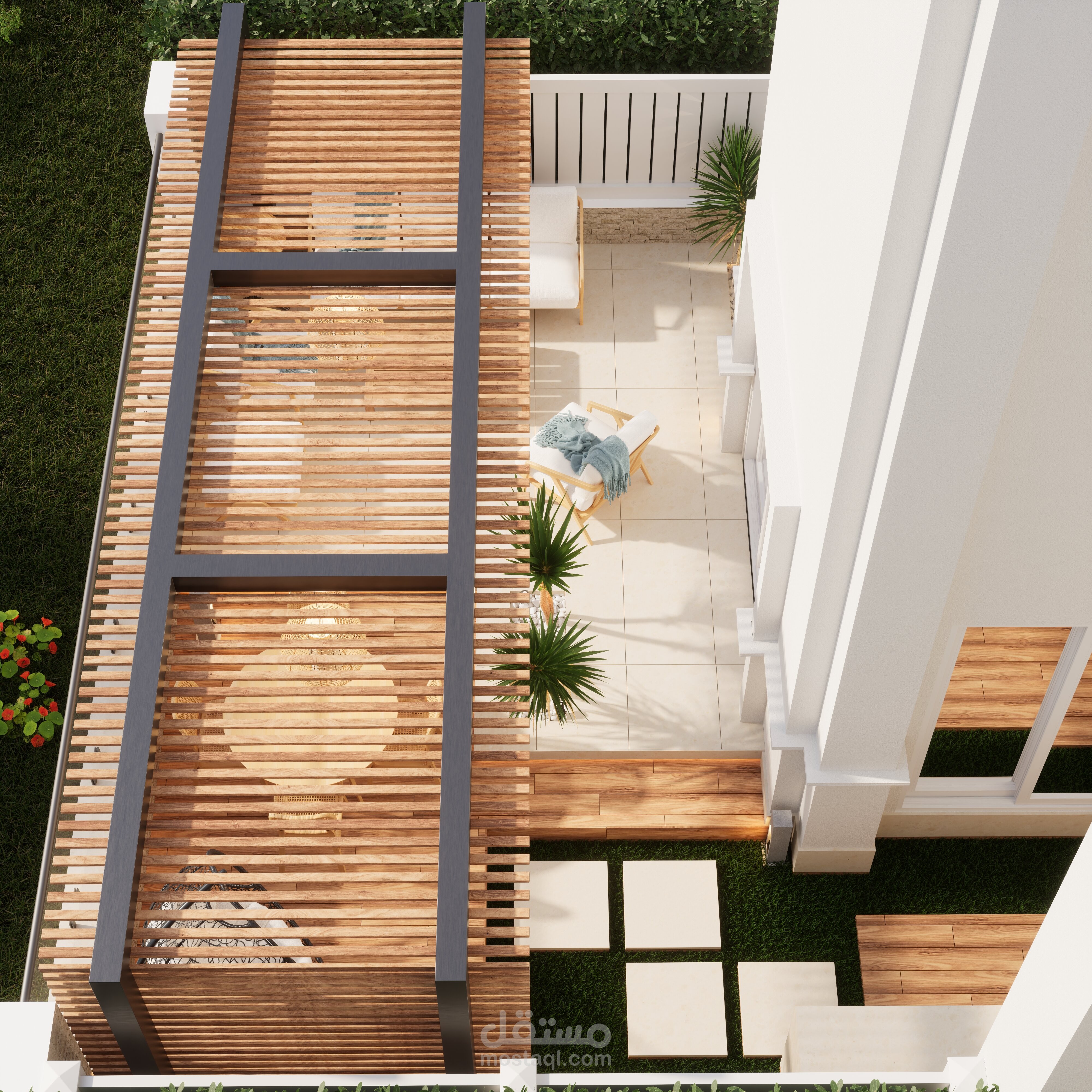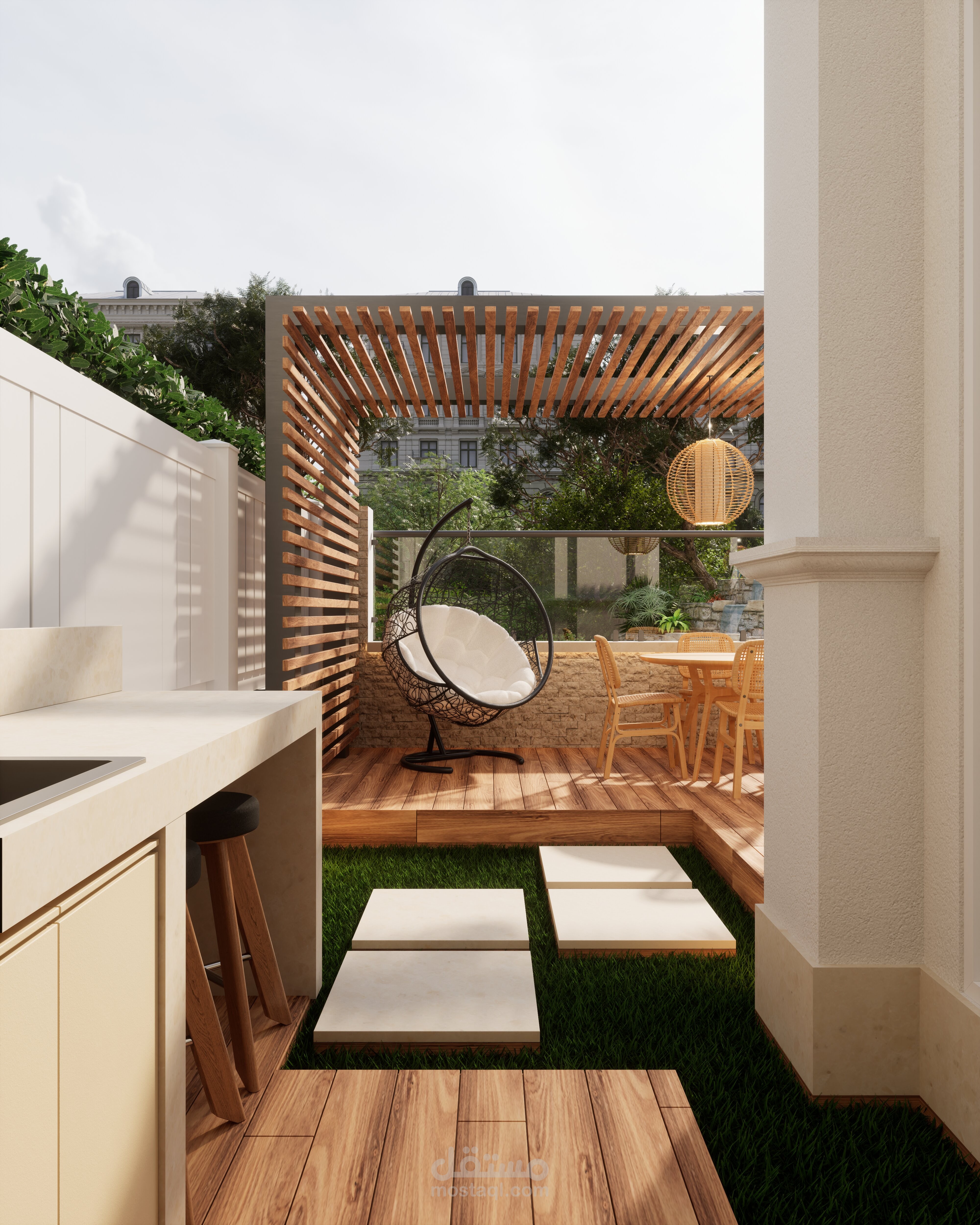 تصميم حديقة خلفية صغيرة مع برجولة steel و مطبخ خارجي