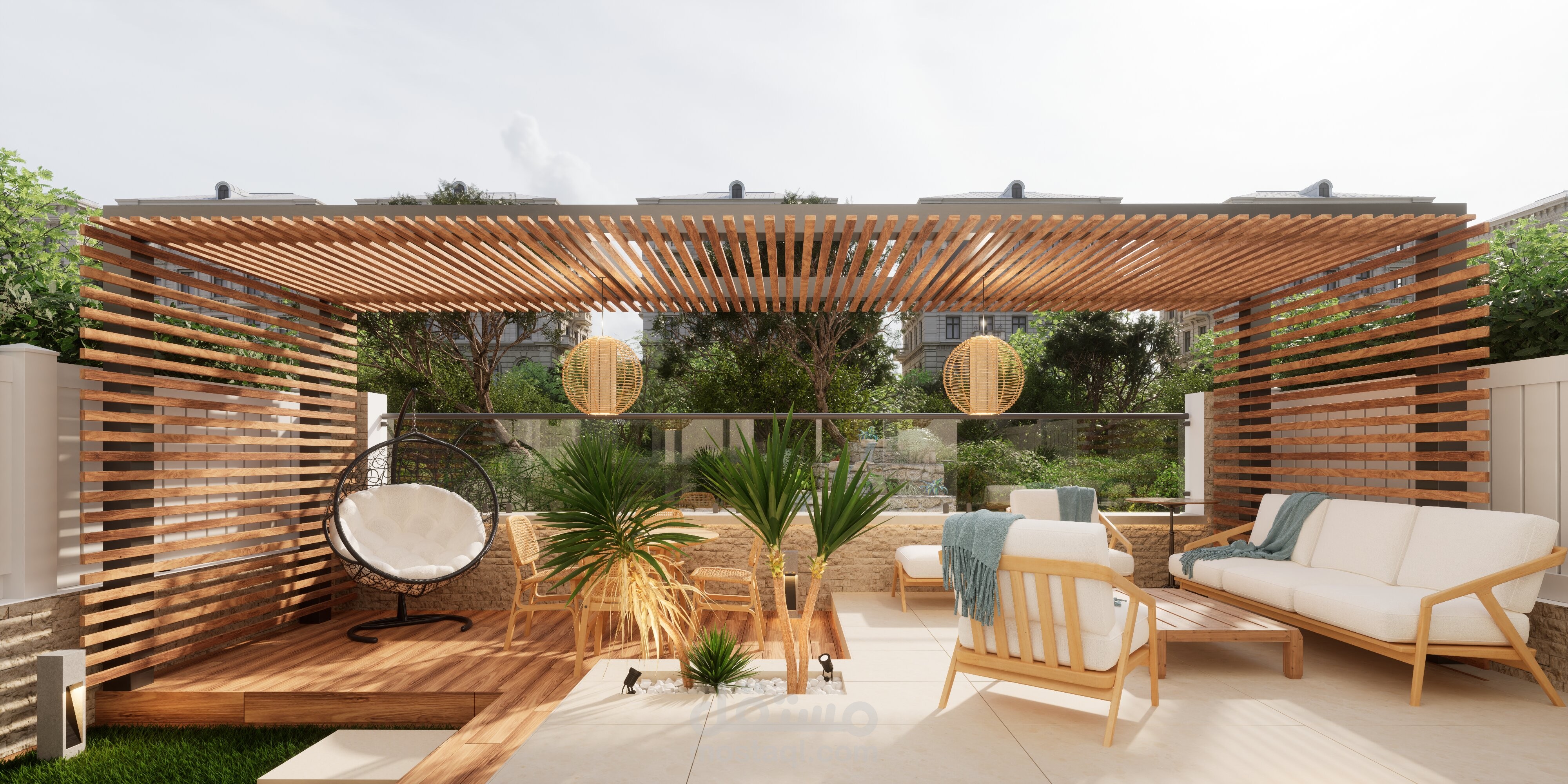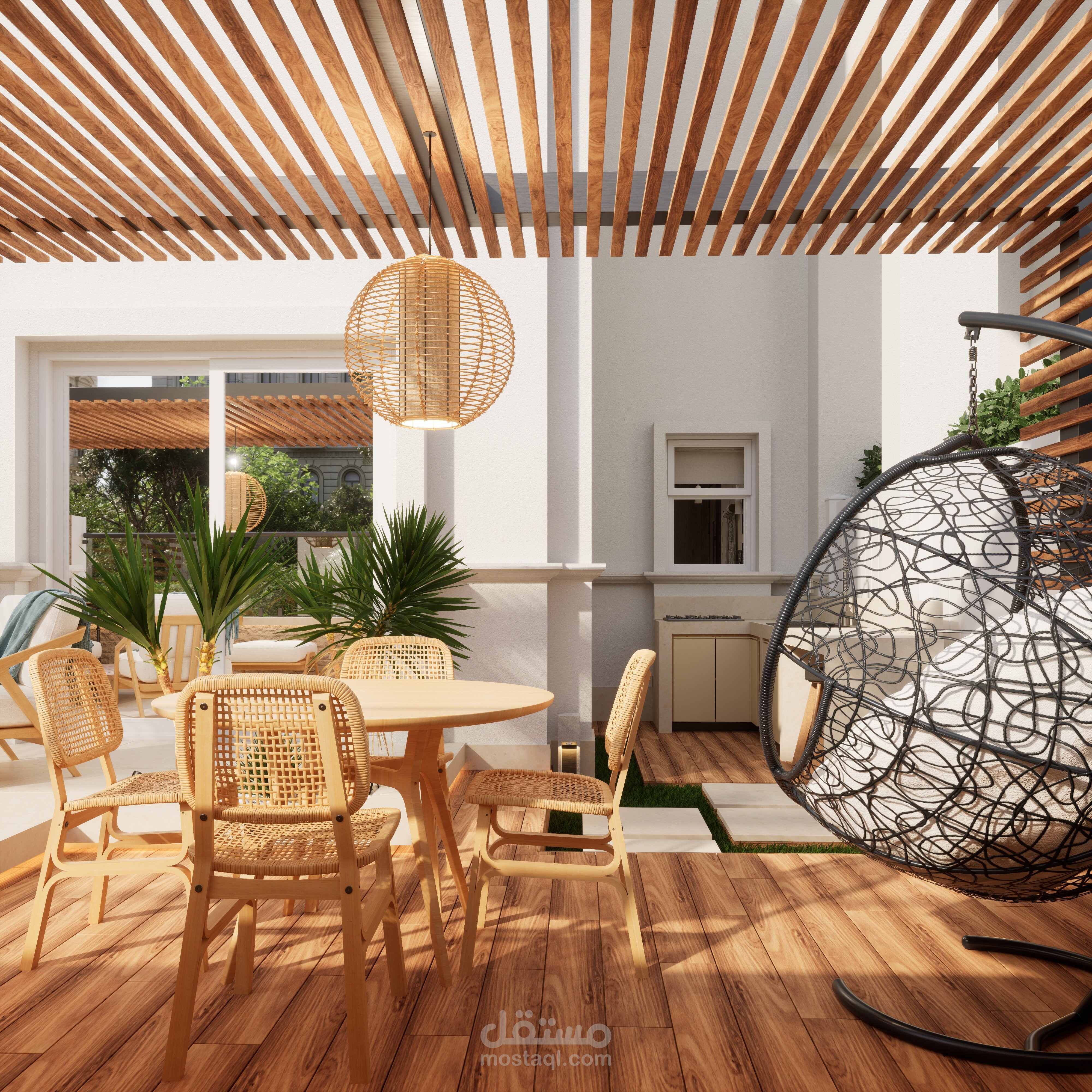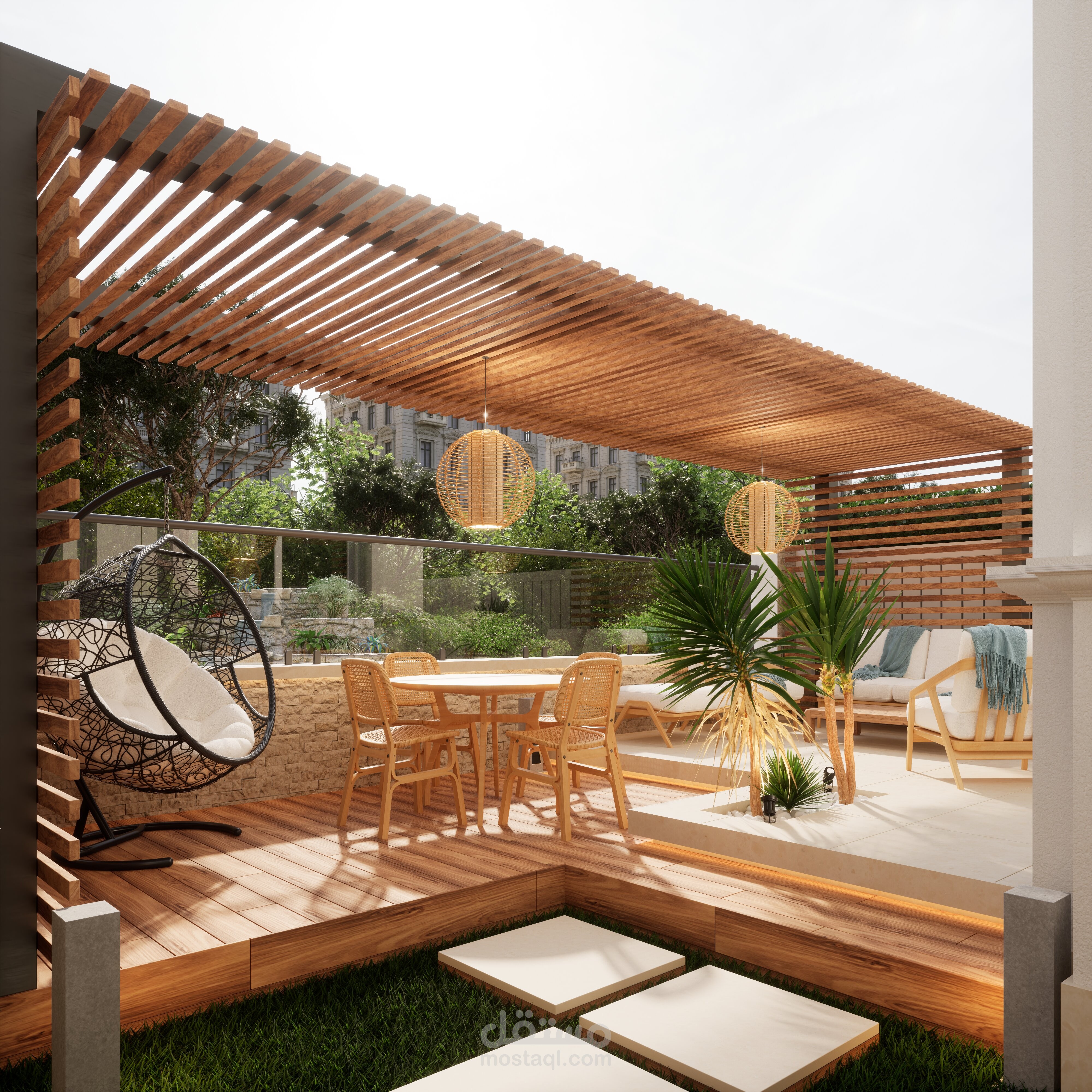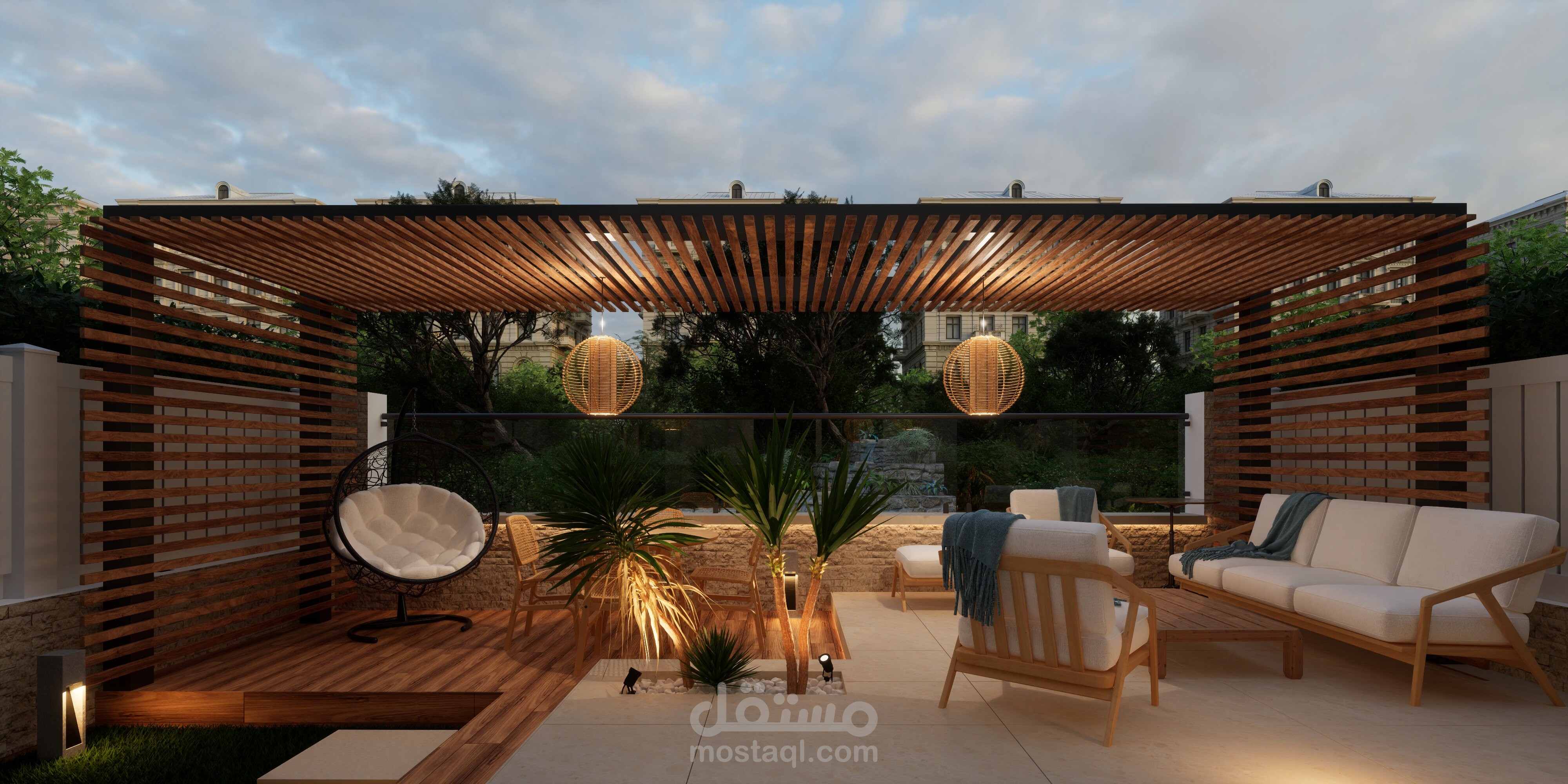 تصميم حديقة خلفية صغيرة مع برجولة steel و مطبخ خارجي