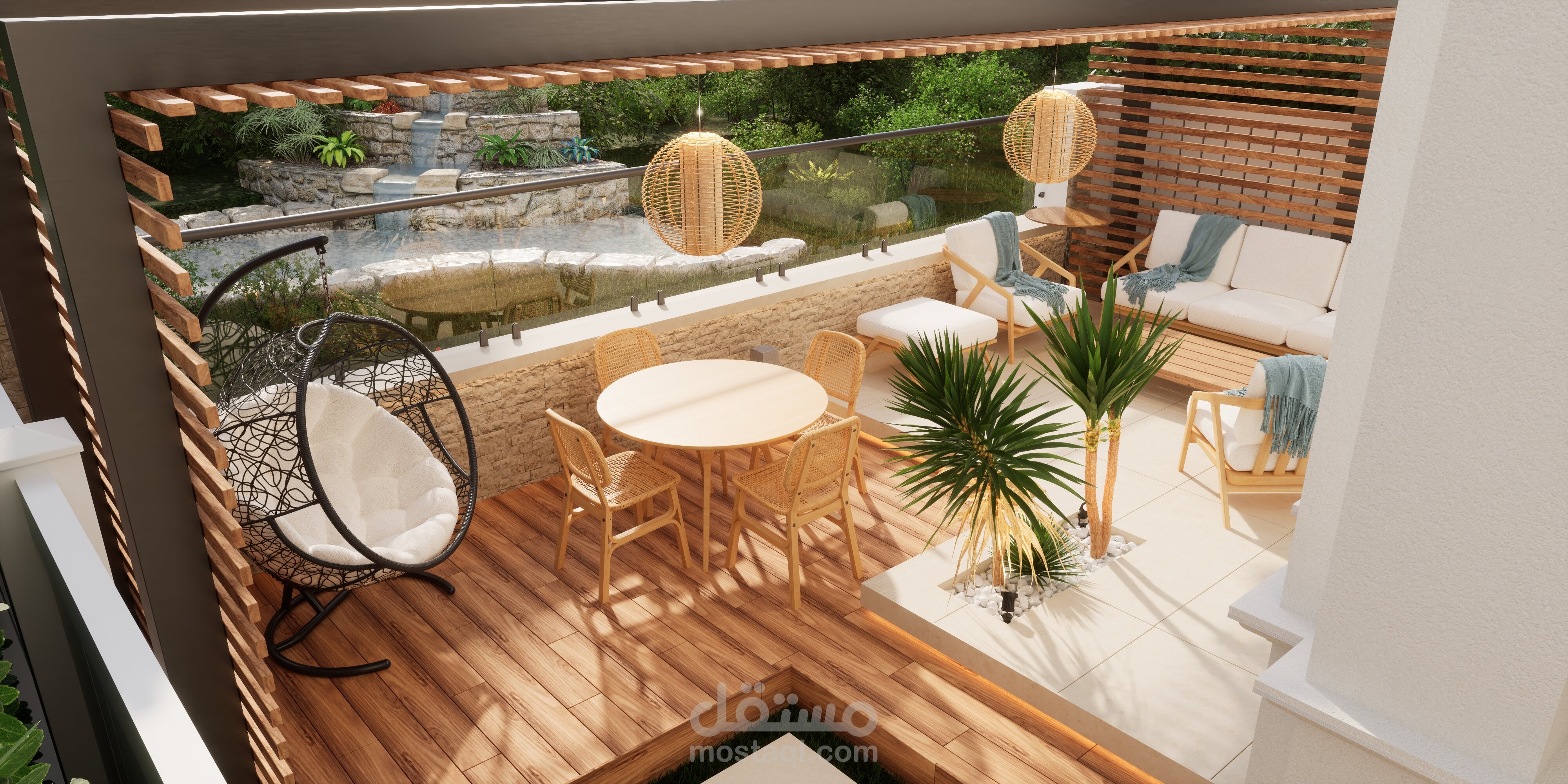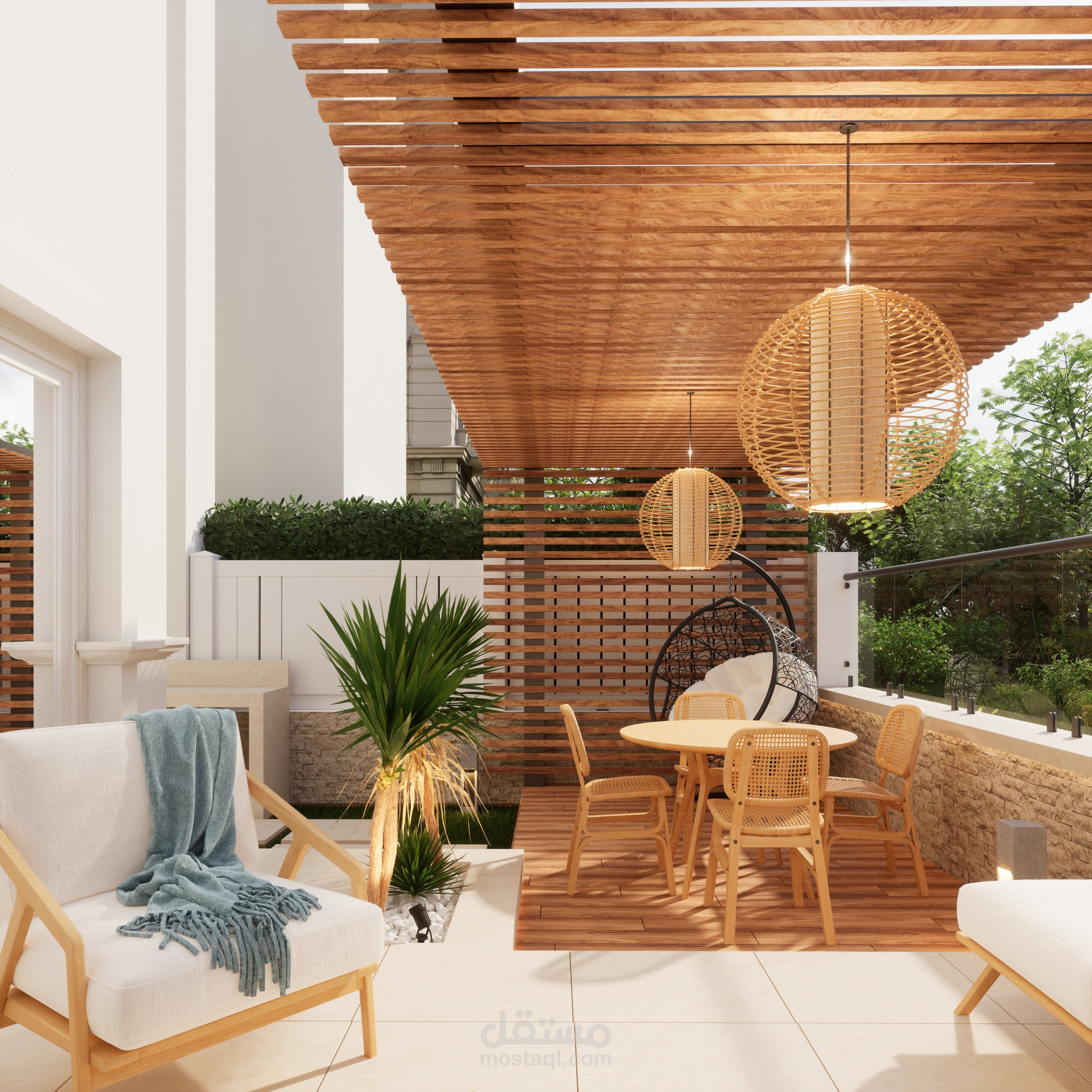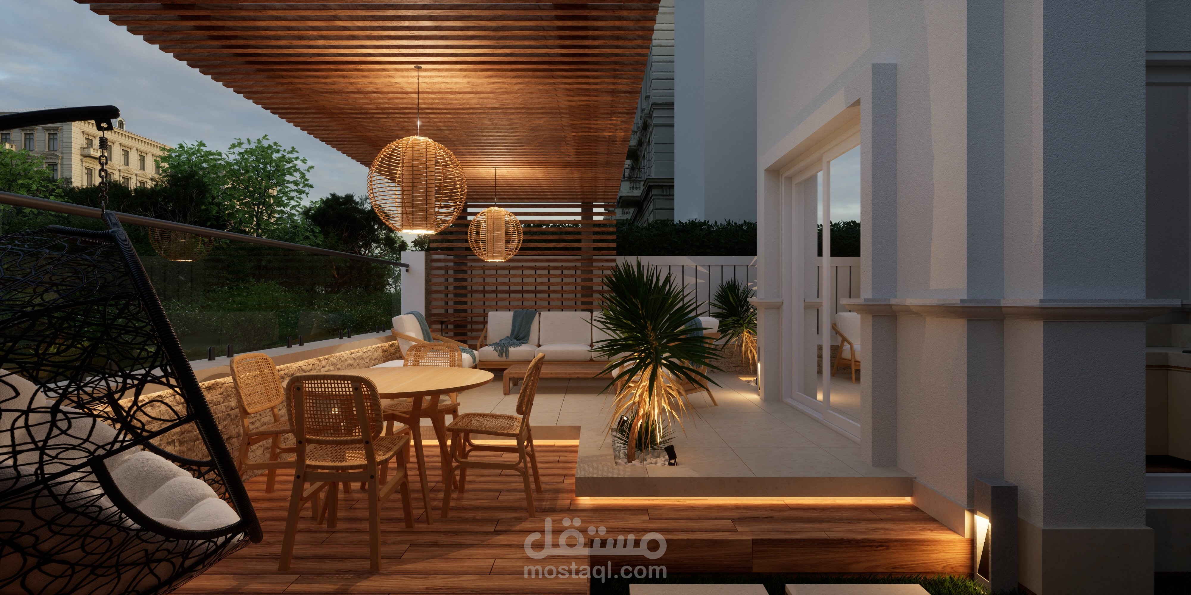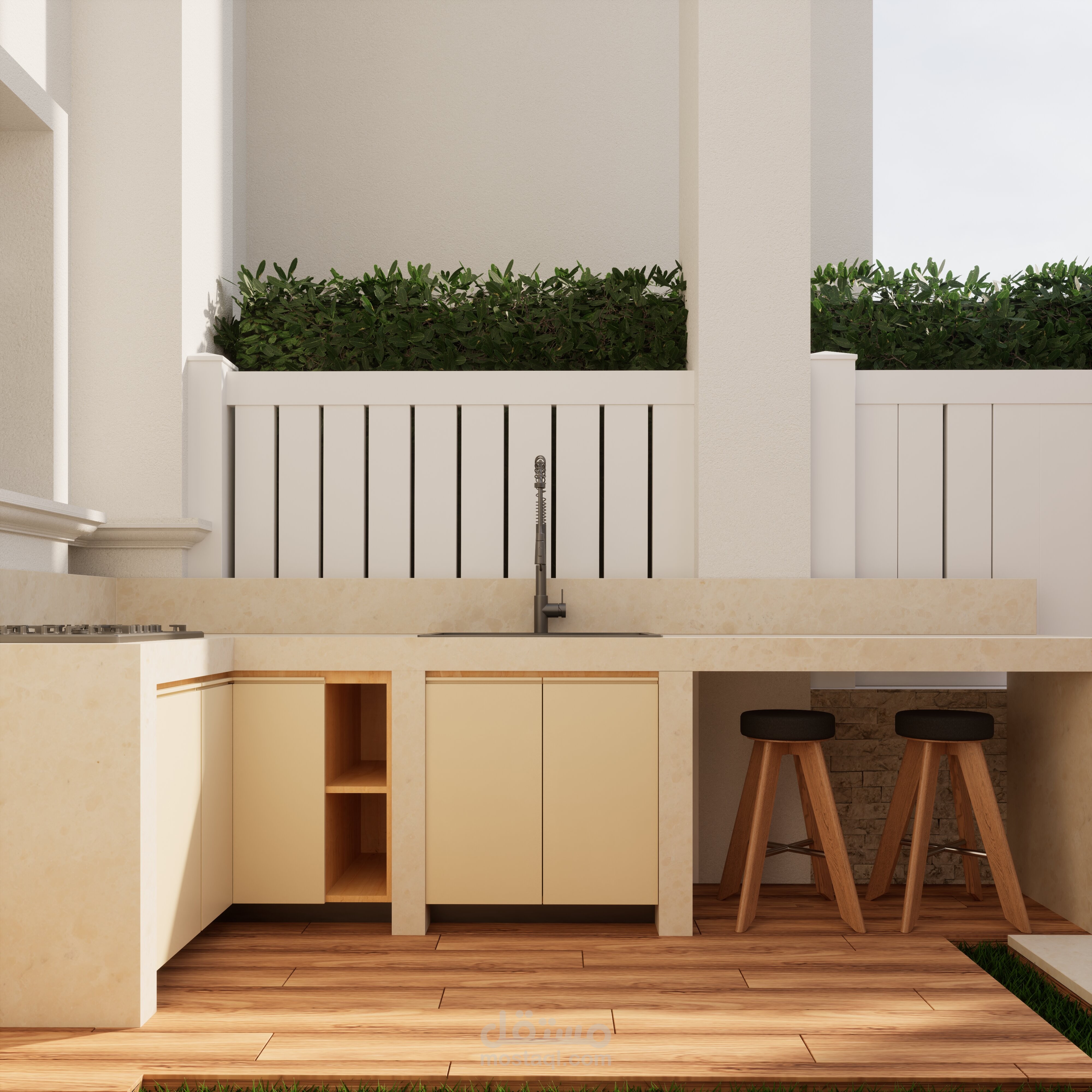تصميم حديقة خلفية صغيرة مع برجولة steel و مطبخ خارجي