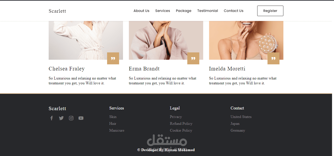 موقع صالون الجمال (Salon Website) هو موقع على الإنترنت يخصص لتمثيل صالون تجميل أو مركز تجميل عبر الويب. يهدف الموقع إلى عرض خدمات الصالون المختلفة وتوفير معلومات مفصلة عنها، بما في ذلك قائمة الخدمات المتوفرة، وأسعارها، والعروض الخاصة إن وجدت، ومعلومات الاتصال ومواعيد العمل.