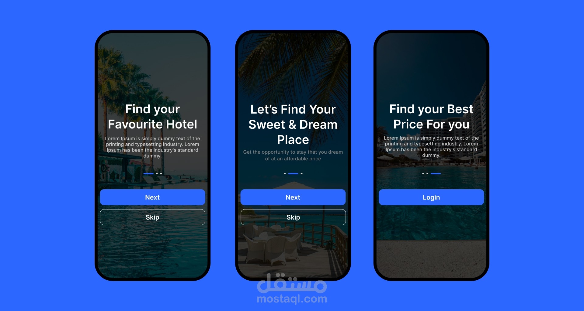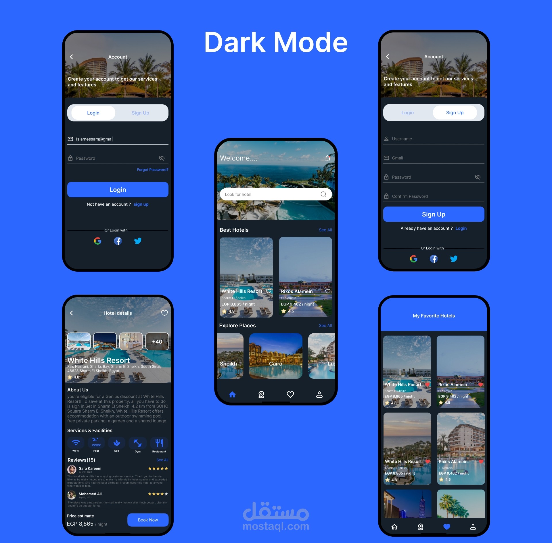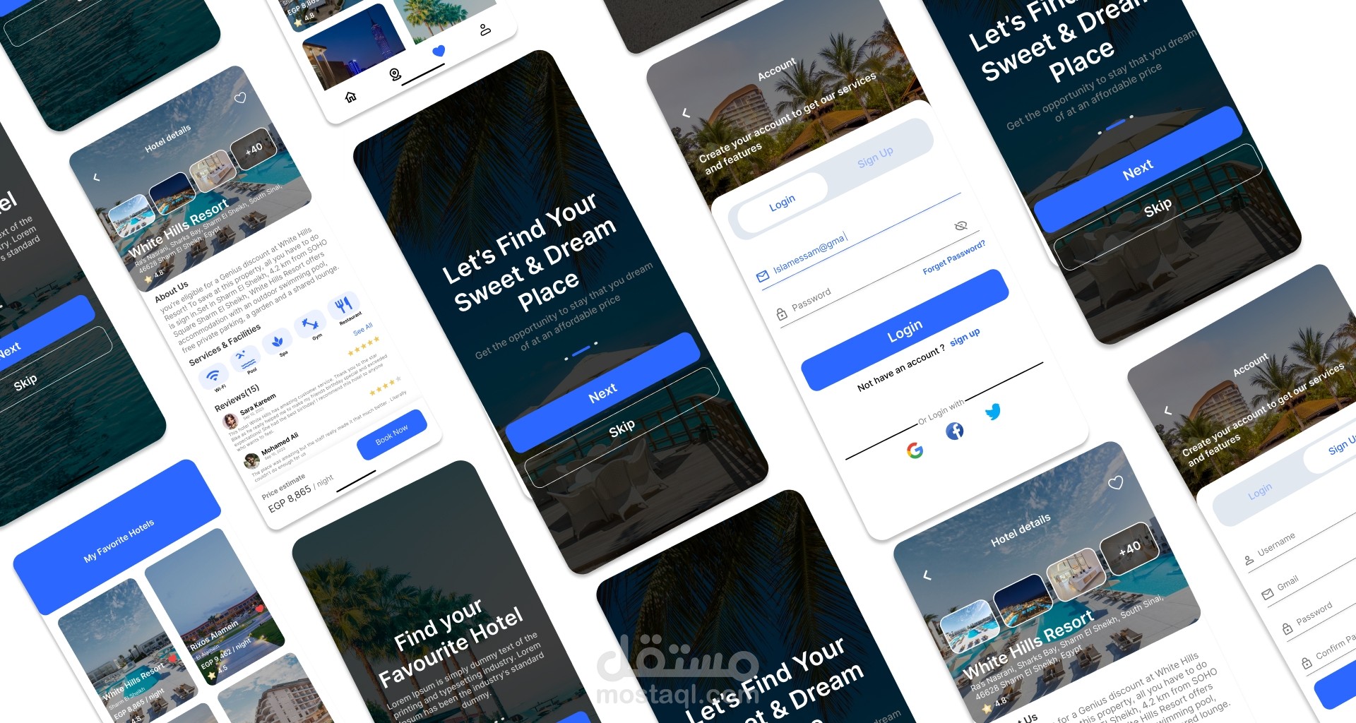 واجهة المستخدم تطبيق يساعد السياح علي اختيار احسن الفنادق الموجودة وقمت بعمل العديد من الصفحات منها login, sign up وغيرها من الصفحات