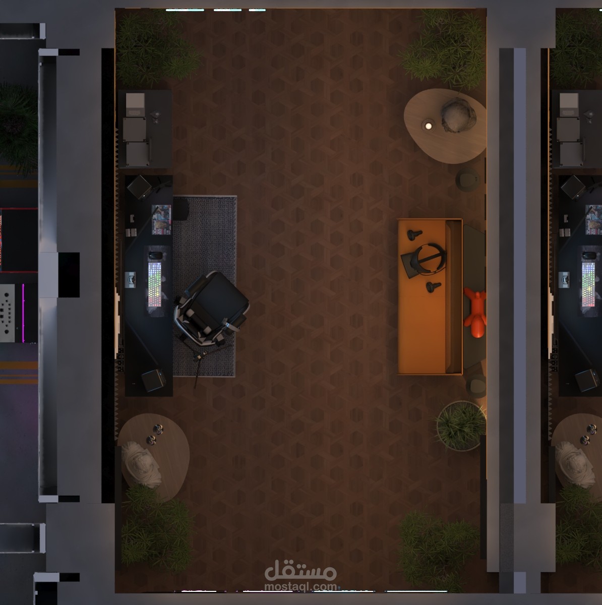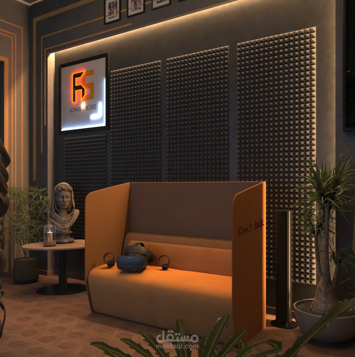 مع وجود كرسي لاستقبال الاصحاب او المرافق او تمكين العميل من ممارسه اللعب عن طريق الواقع الافتراضي.