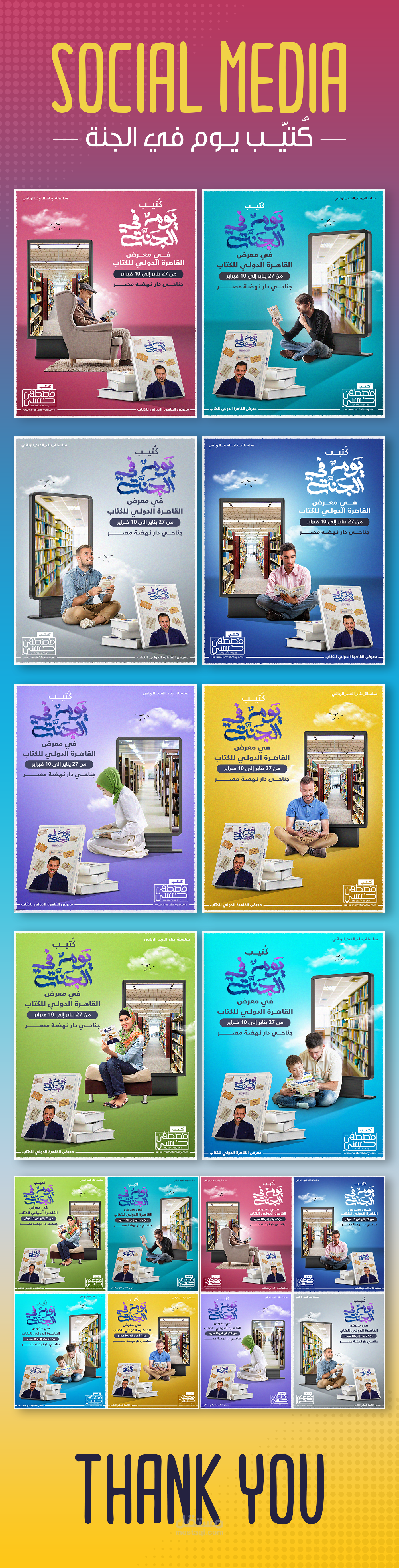 مجموعة تصميمات سوشيال ميديا لصفحة الداعية مصطفى حسني لأحدث كتبه يوم في الجنة