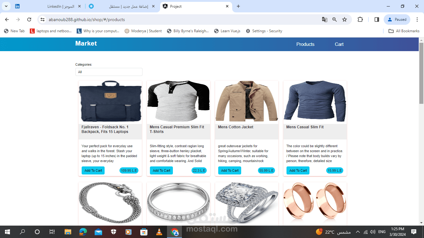 موقع تسوق يعرض منتجات لمستخدم ويستطيع شراء هذه المنتجات واضافة كل منتج يتم اختياره الى سلة التسوق وعرض السعر لكل المنتجات