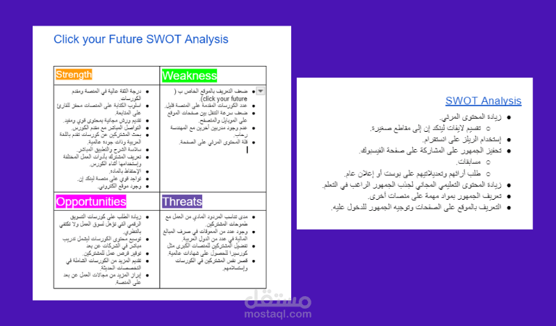 -SWOT Analysis يحدد لك نقاط الضعف والقوة والفرص المتاحة أمامك وأهم المهددات لاستمرارك في السوق.