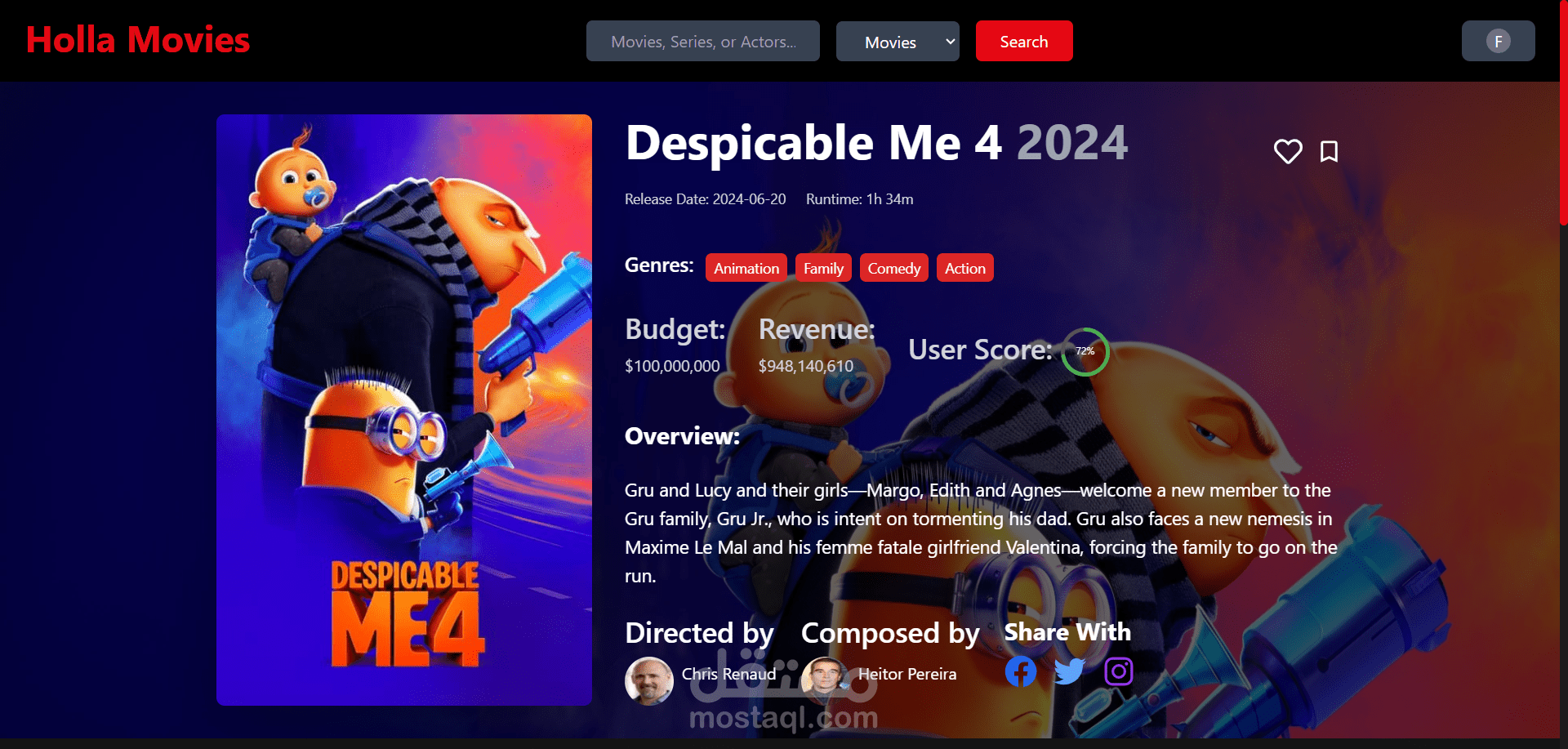 Holla Movies عبارة عن منصة بث سهلة الاستخدام توفر مجموعة واسعة من الأفلام والبرامج التلفزيونية. يتميز موقع الويب بواجهة سهلة التنقل، مما يسمح للمستخدمين بالبحث عن المحتوى وتصفيته حسب النوع وسنة الإصدار والشهرة. يمكن للمستخدمين مشاهدة المقطورات وقراءة الملخصات وعرض التقييمات قبل تحديد اختيارهم. تهدف Holla Movies إلى تحسين تجربة المشاهدة من خلال تقديم محتوى عالي الجودة وتدفق سلس.