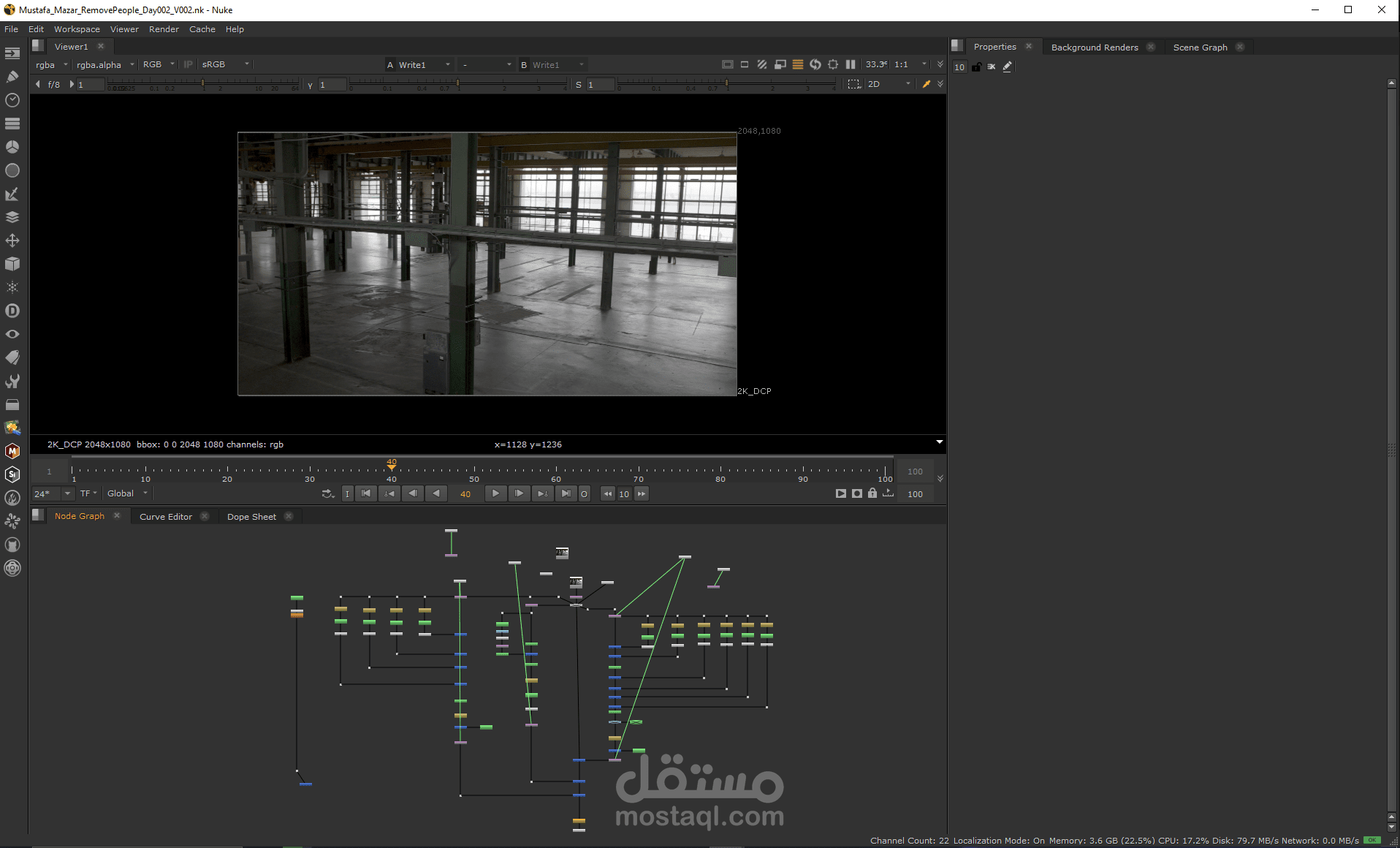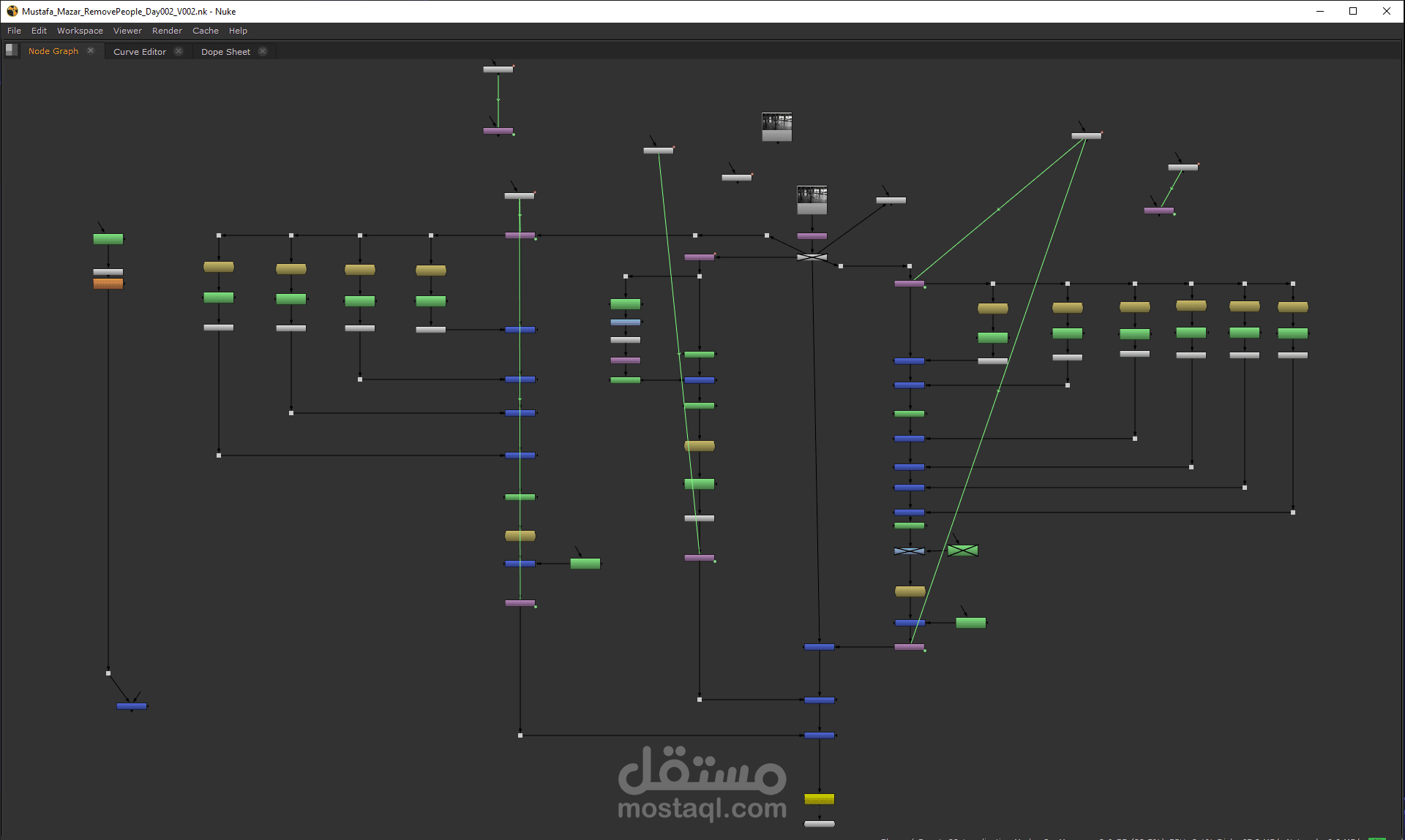 اول مرحلة قمت بصنع clean plate والقايم ب roto pain + roto على اماكن الشخص ومن ثم اضافة تراك للصورة وهكذا مع باقى الشخصيين الاخرين مع تعديل اى فرق اضاءات