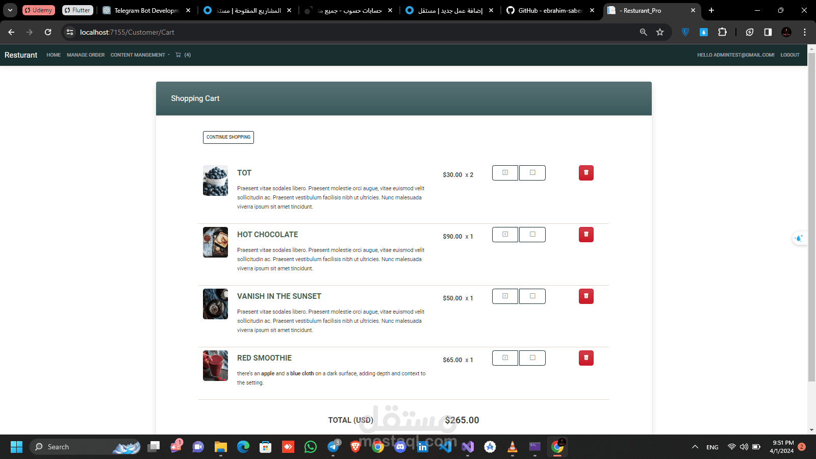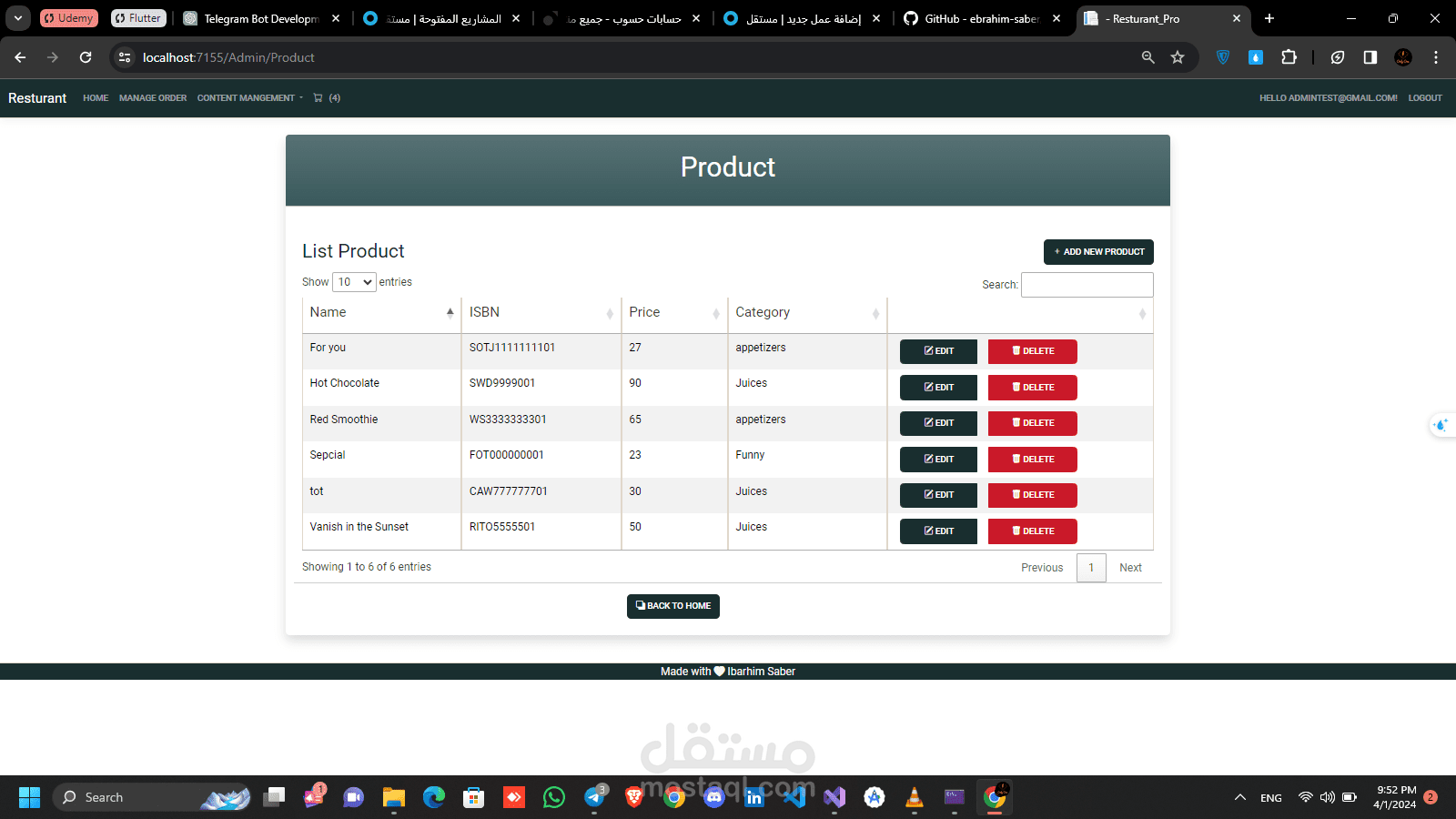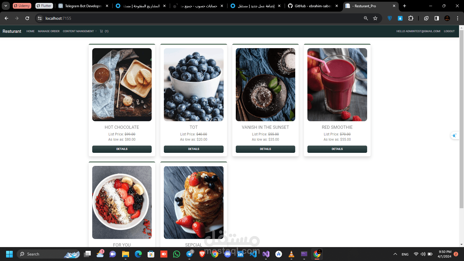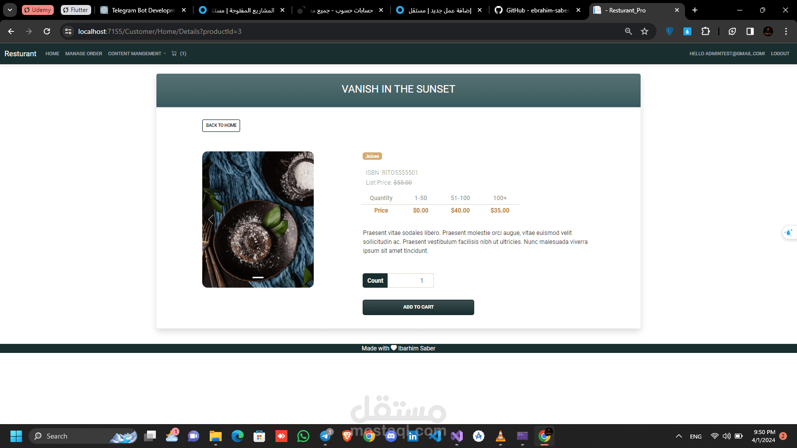 2- يوجد صفحه لتعديل المنتجات و اضافه وصف للمنتج او الاكله و وضع عرض او سعر مبدئي و سعر نهاني و سعر خاص في حالة اذا اشتري العميل اي اكلة بكيمات معينه و يمكنك وضع وصف للاكله و ايضا رفع صور لها اذا احببت يمكنك رفع اكثر من صورة
