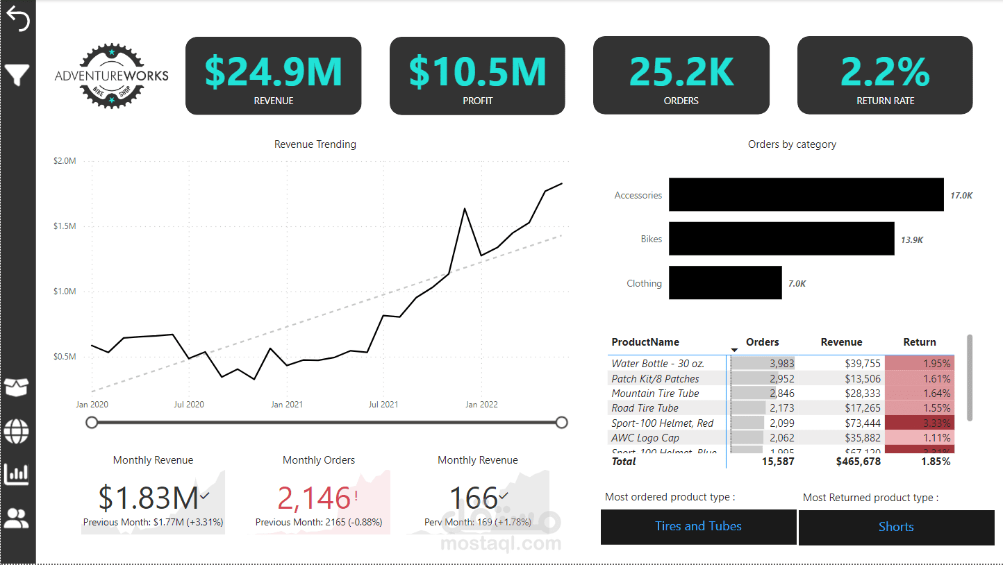 Dashboard for a Bike shop, visualizing main KPIs like revenue, profit, orders, return rate.
