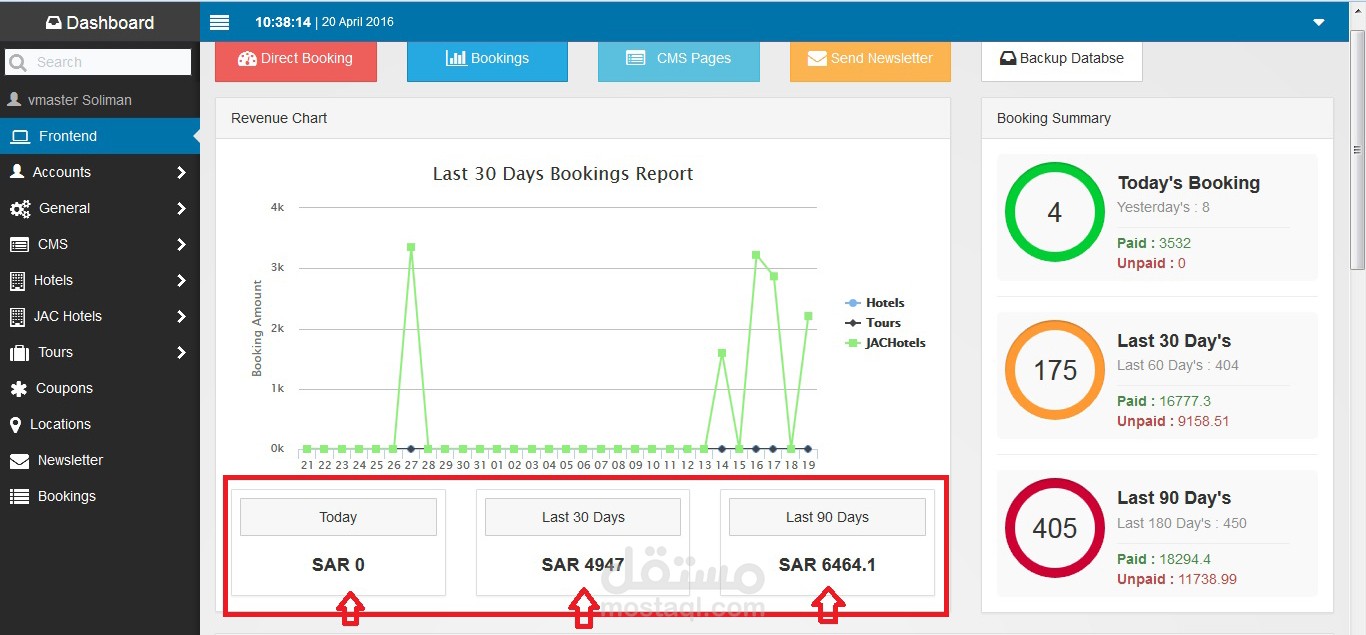 Dashboard Admin and, supplier to review revenue chart graph report and recent booking report of booking transaction