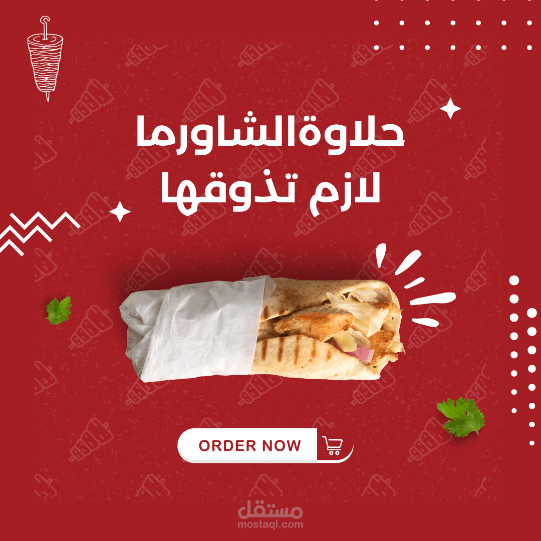البوستر الإعلاني يبرز أجواء المطعم بشكل مميز وجذاب، حيث يتميز بتصميم ملون وحيوي يجذب الانتباه. يتوسط البوستر صورة لطبق شاورما مغرية ومشهية.