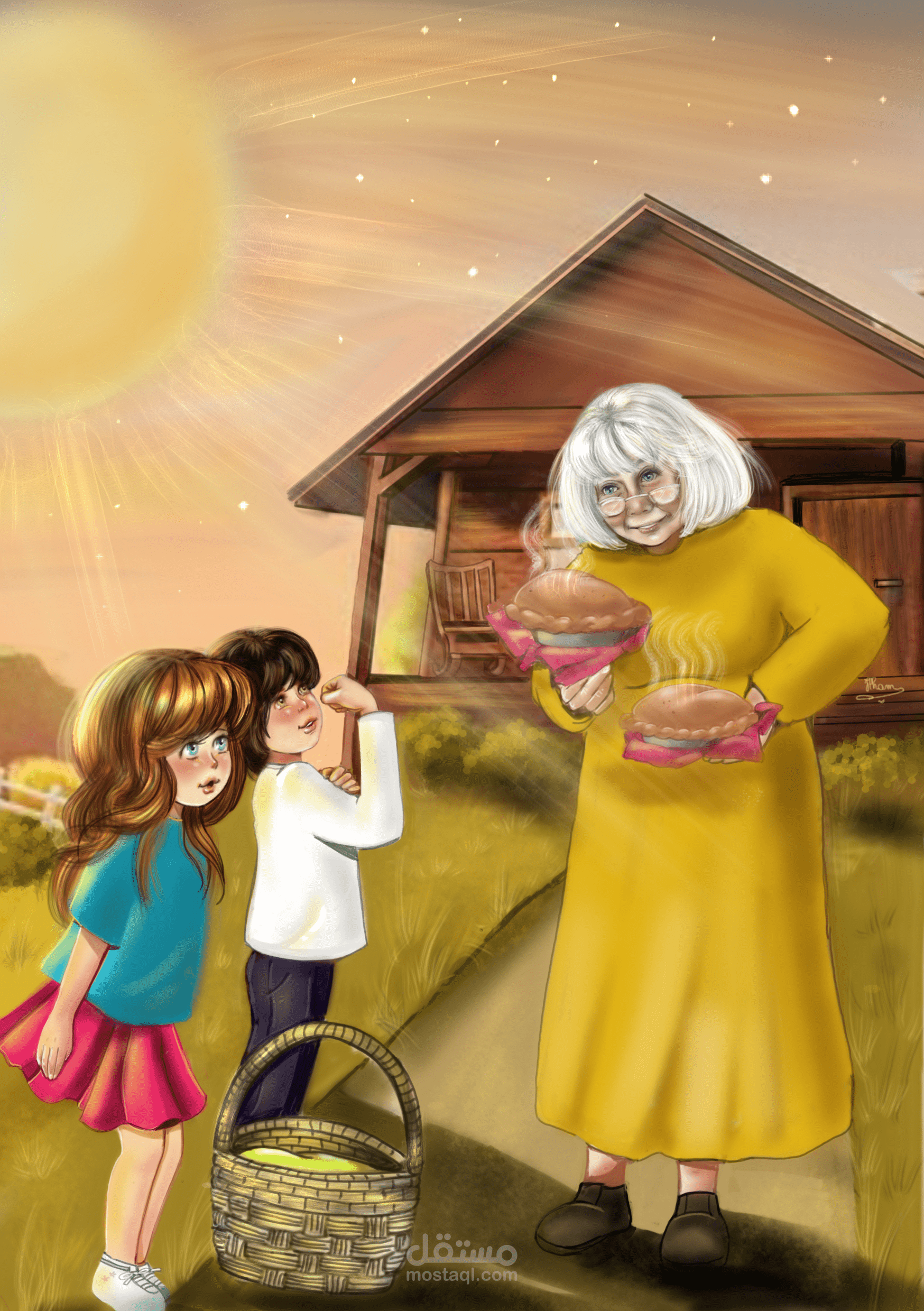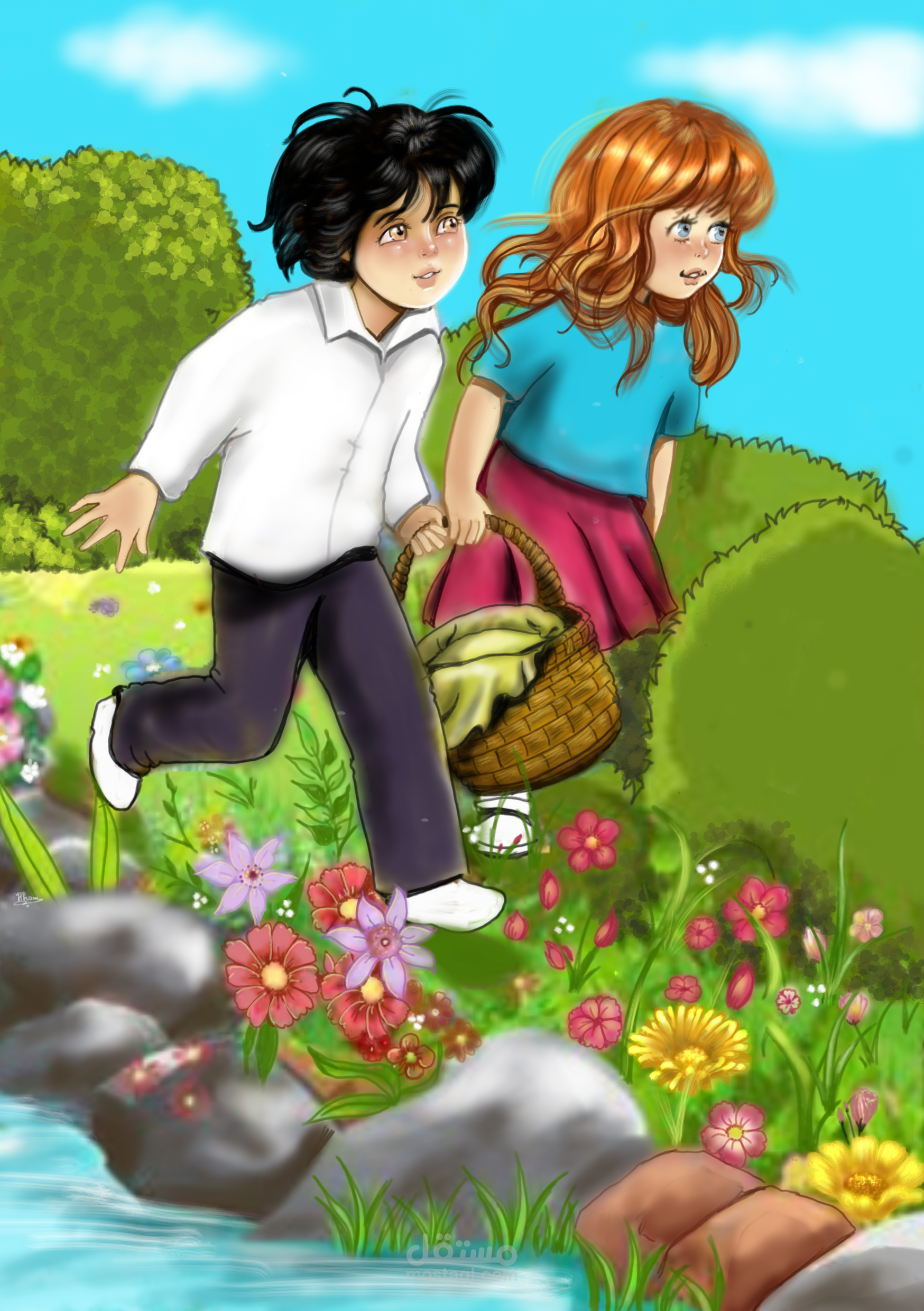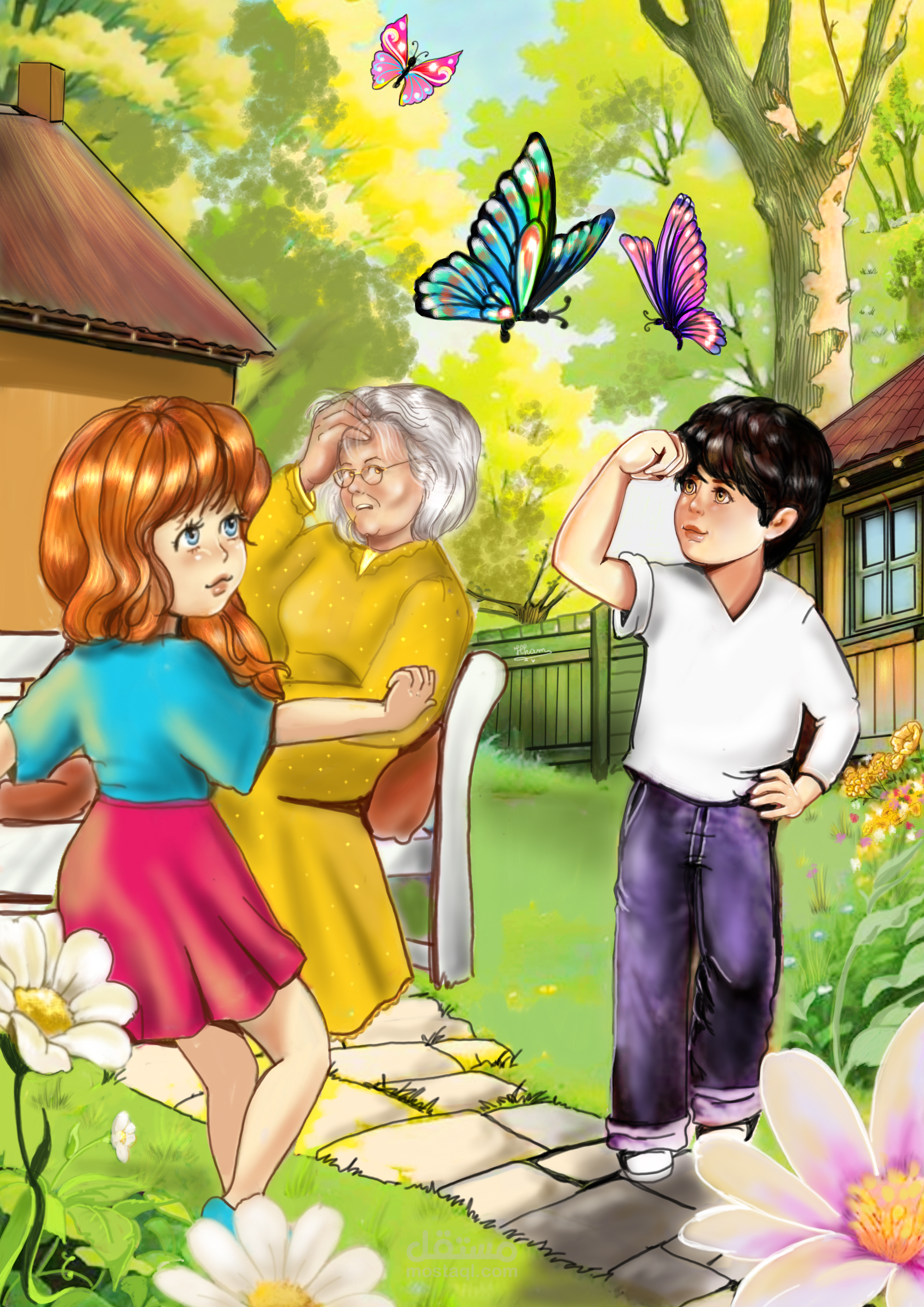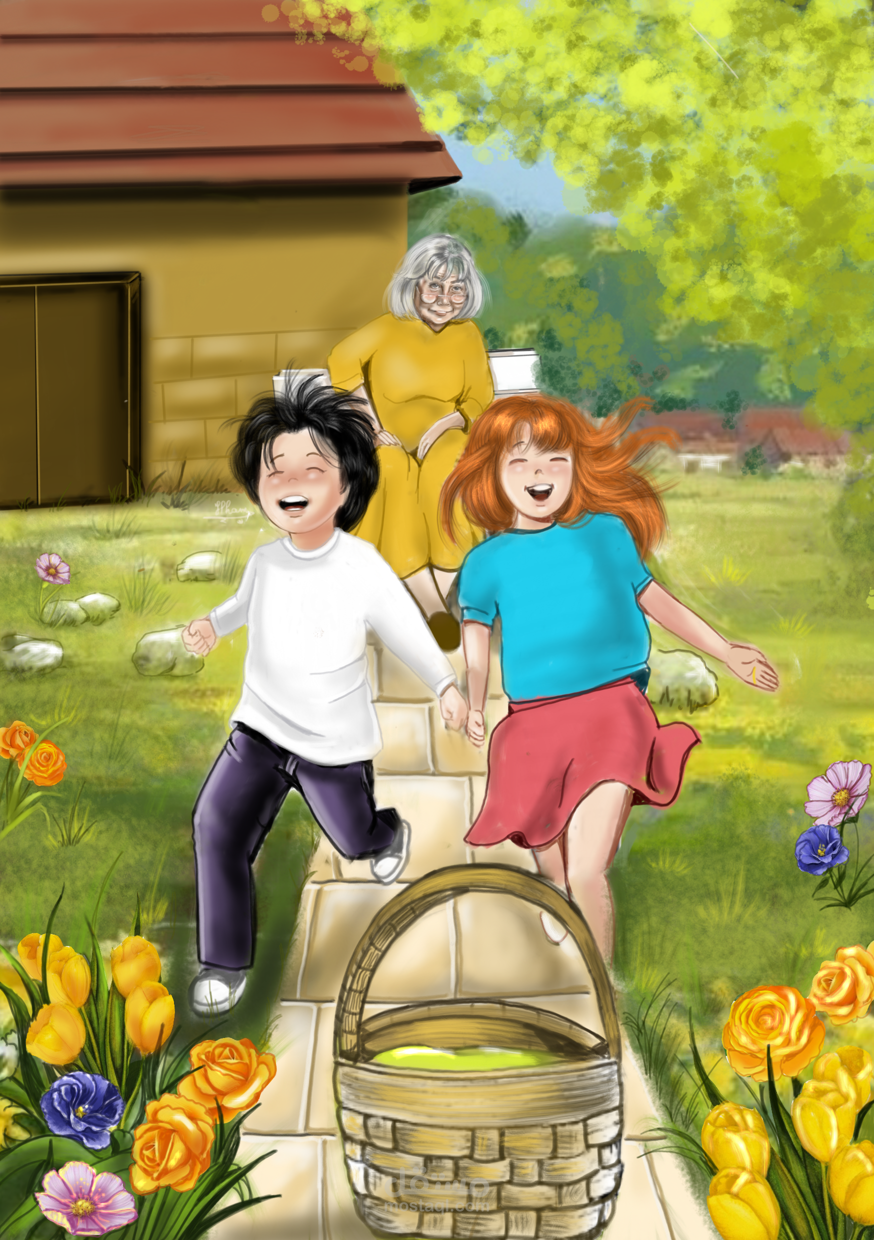 قصة اخ واخت يتسابقان على جلب ثمار شجرة بعيدة لجدتهما ..رسمت صفحات الكتاب باليد ولونتها على شاشة الهاتف .