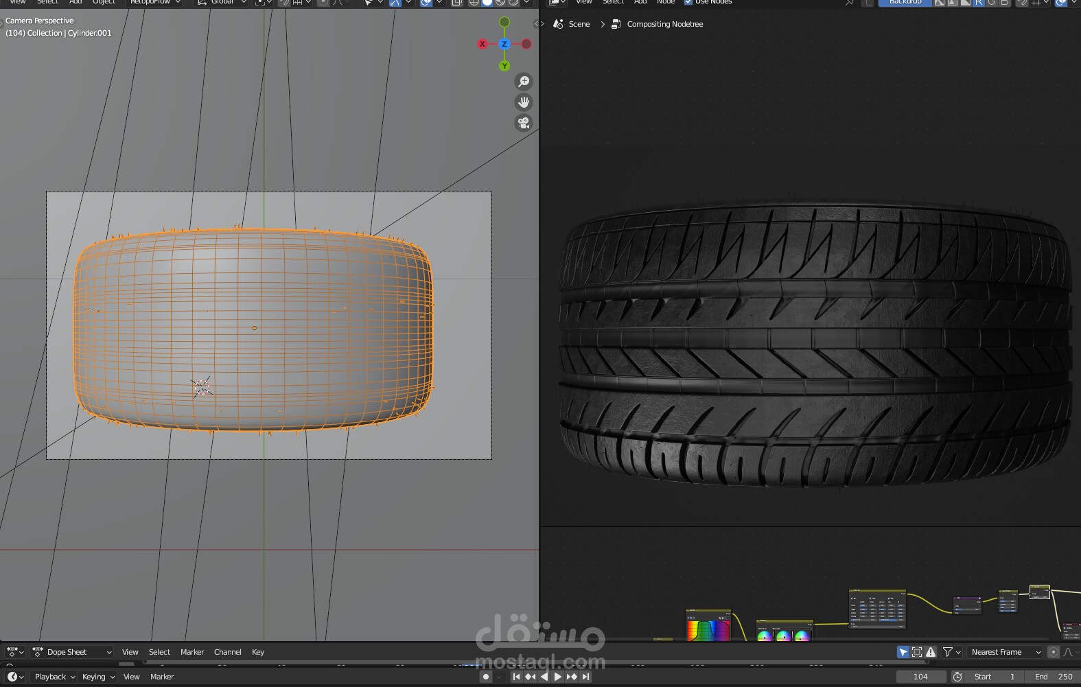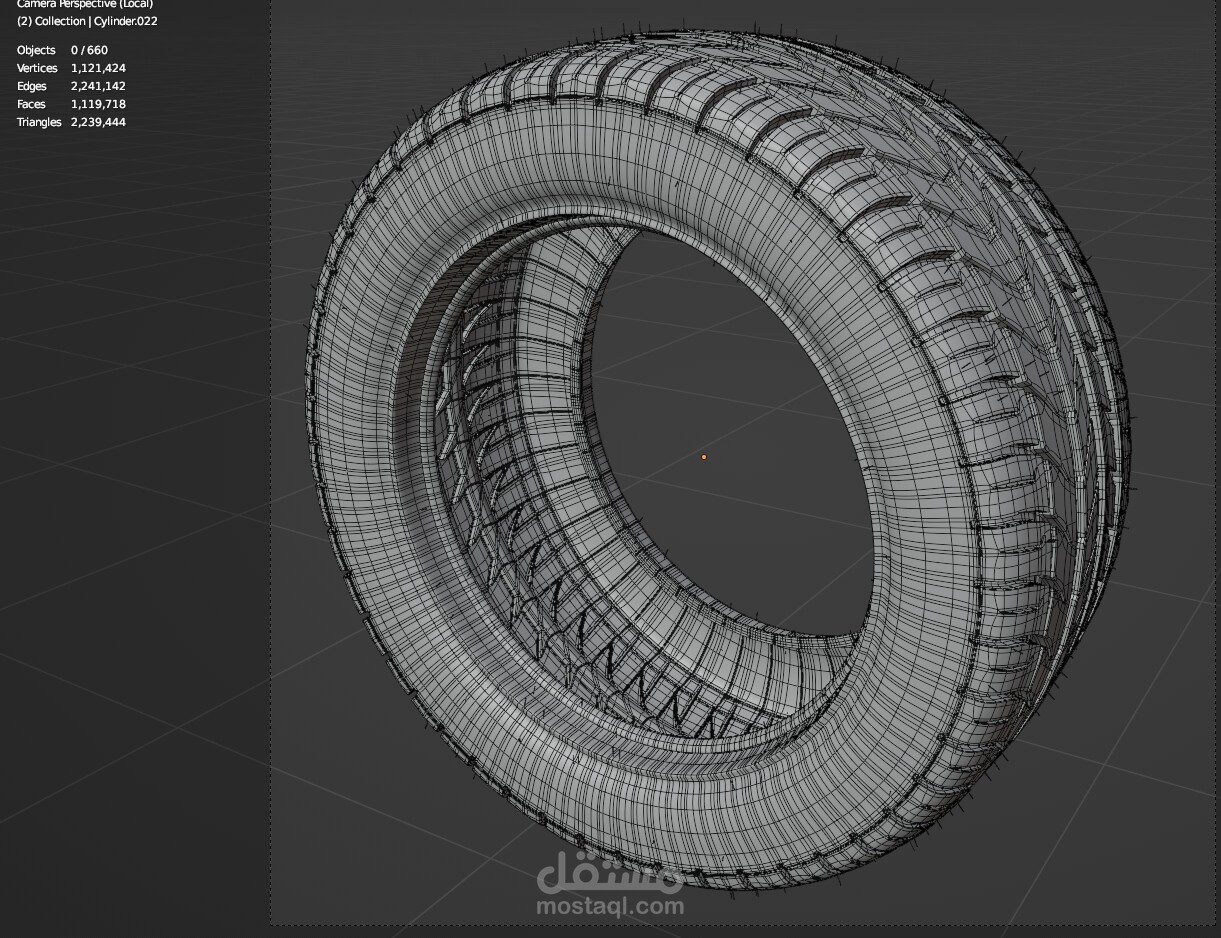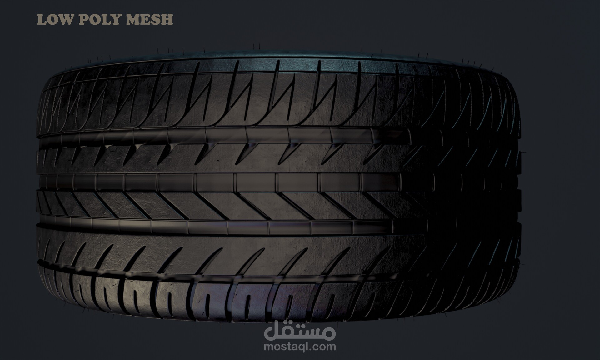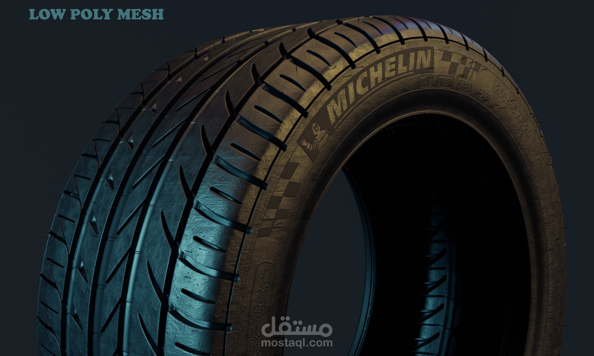 I started from scratch for this tire. I created a high poly mesh and baked it to get a high-quality normal map and displacement map. I created a vector in Illustrator to Paint height in mesh for the Michelin logo and tire detail. In the end, add small particles to get a low poly tire more realistic by geometry nodes and composite in Blender.