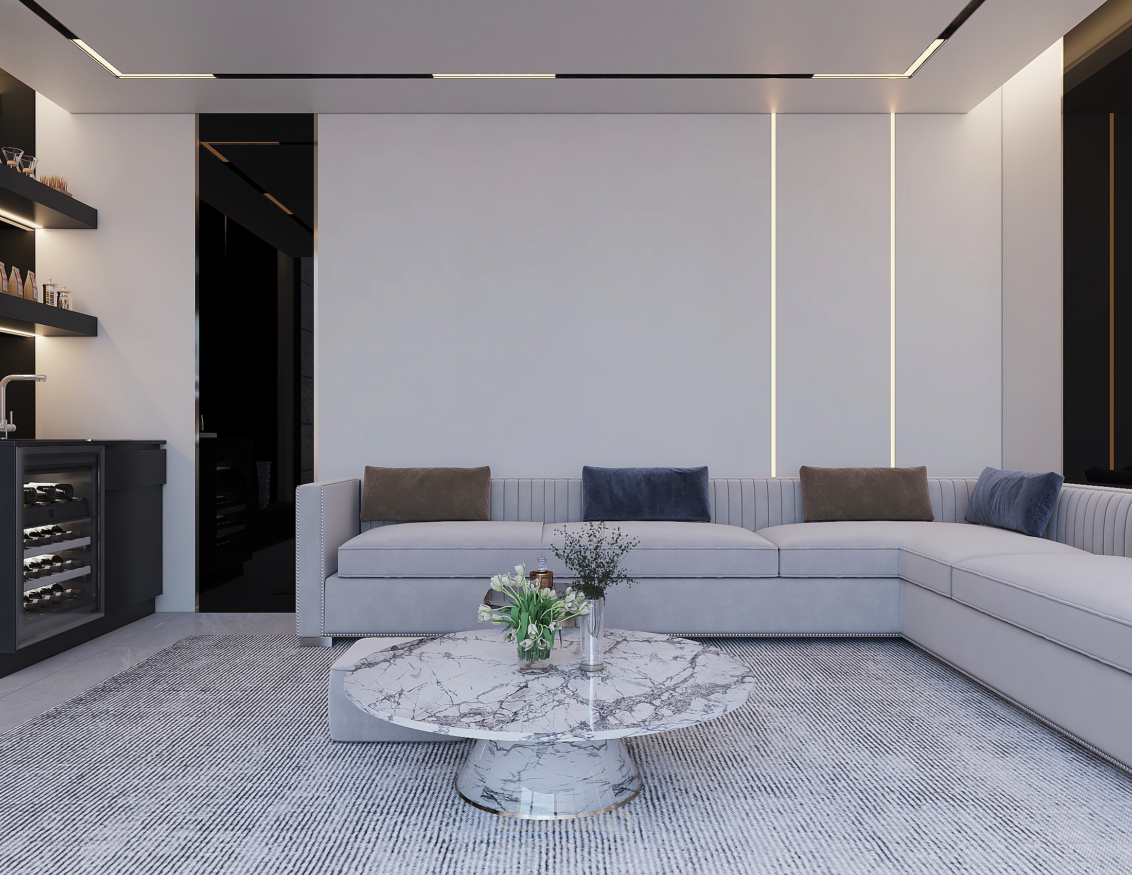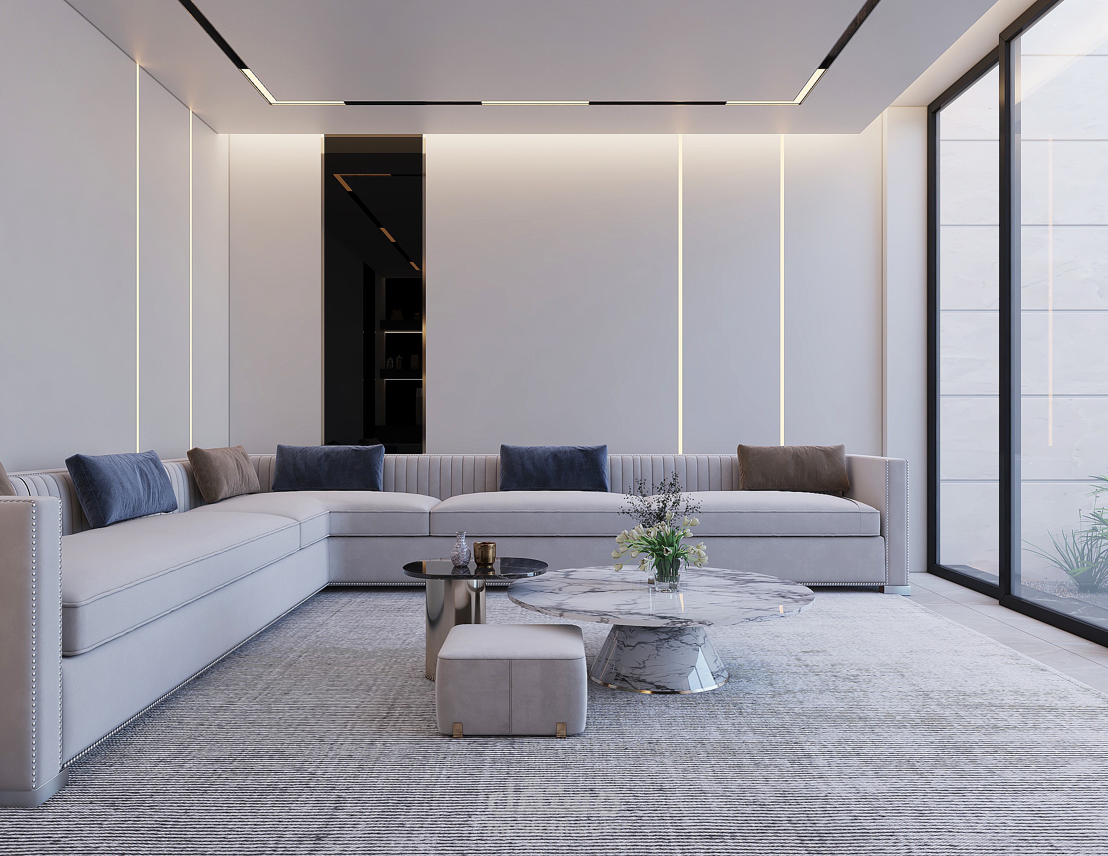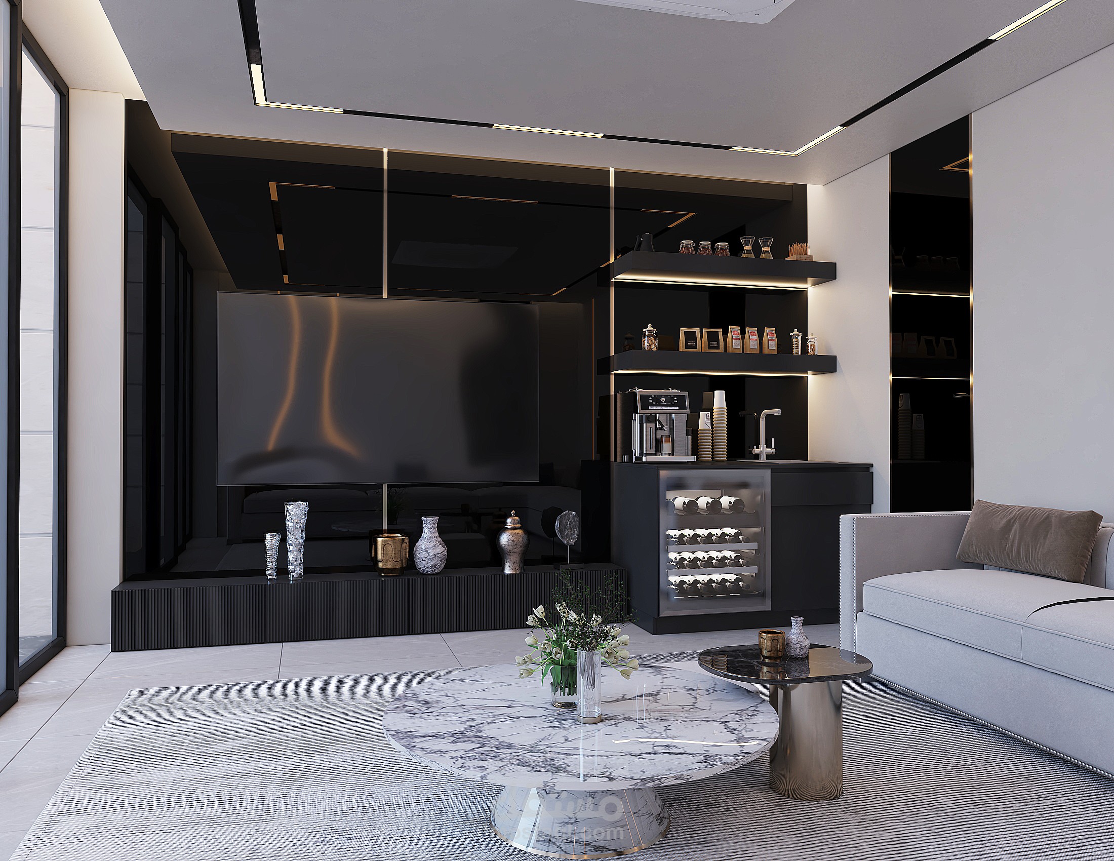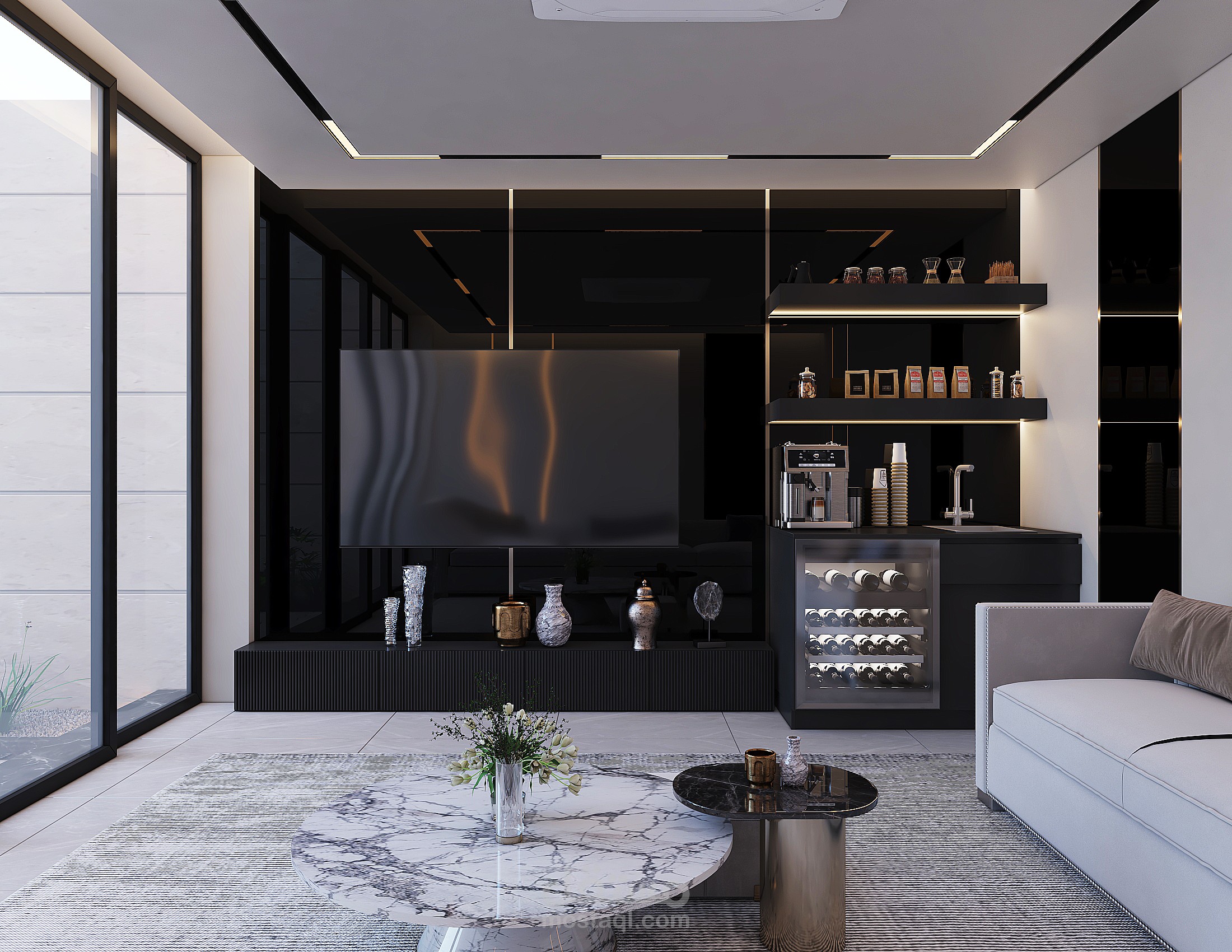 تصميم ديوانية خارجية نمط التصميم مودرن مع اضافة الليد بروفايل مع المريات السوداء