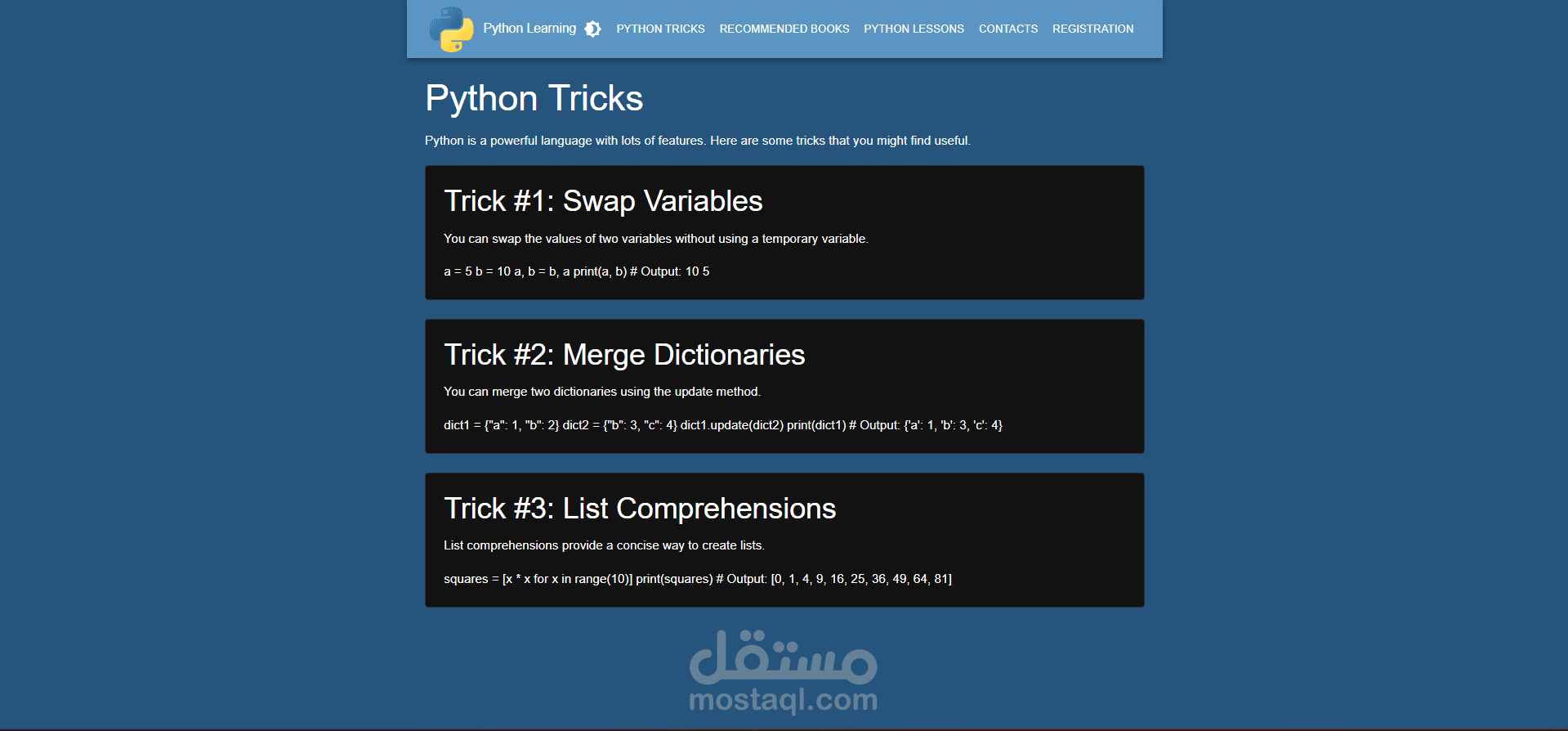توفير محتوى تعليمي متنوع يشمل الأمثلة العملية، الأسئلة المتكررة، والنصائح البرمجية.