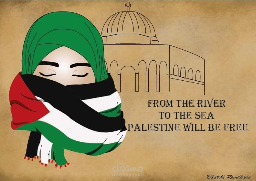انجاز صورة تعبيرية لدعم القضية الفلسطينية لصفحة بالفايس بوك ، طلب منا الحريف انجاز صورة تكون دعمة للقضية و اعطنا الحرية في اختيار التصميم فقمنا بلمستنا الخصة حيث استملنا illustrator لانجاز صورة المرأة و بعد ذلك قمنا بانجاز مجسم لمسجد قبة الصخر و ارفقناها بجملة من النهر الي البحر فلسطين ستكون حرة